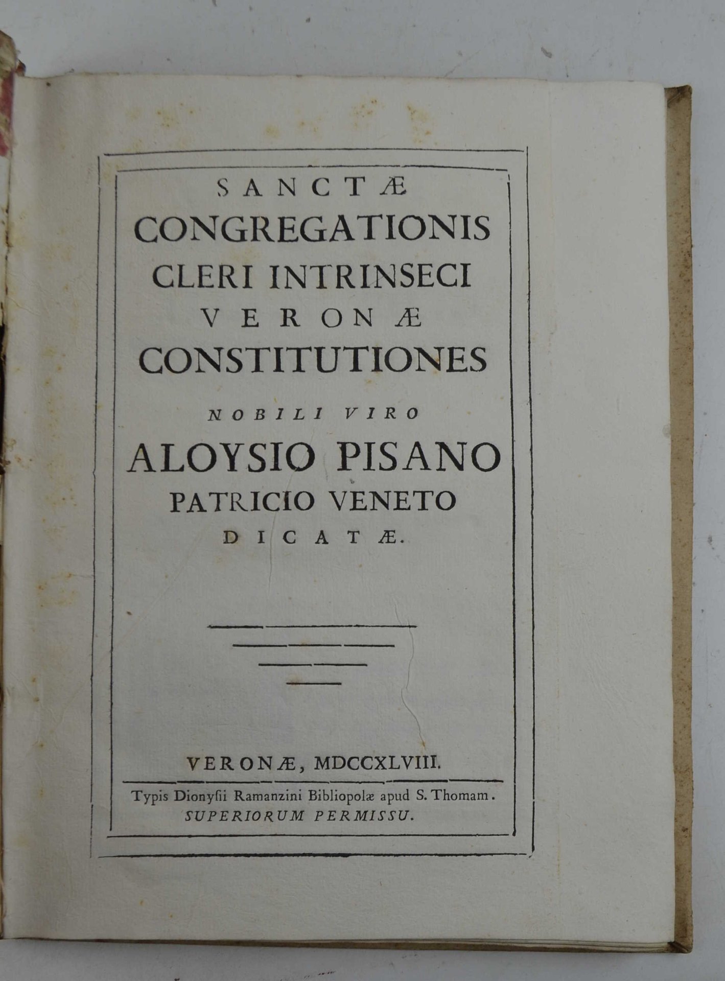 Sanctae congregationis cleri intrinseci Veronae constitutiones nobili viro Aloysio Pisano patricio veneto dicatae.