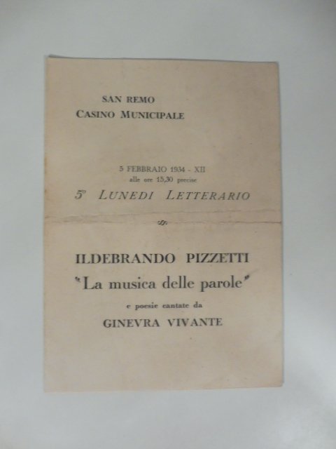 Pieghevole di 4 facciate (ciascuna misura cm 12,5 x 17) con piega nel mezzo. Pieghevole d'invito al pomeriggio letterario presso il Casino di Sanremo del 5 febbraio 1934 con arie italiane cantate da Ginevra Vivante e liriche di Ildebrando Pizzetti.