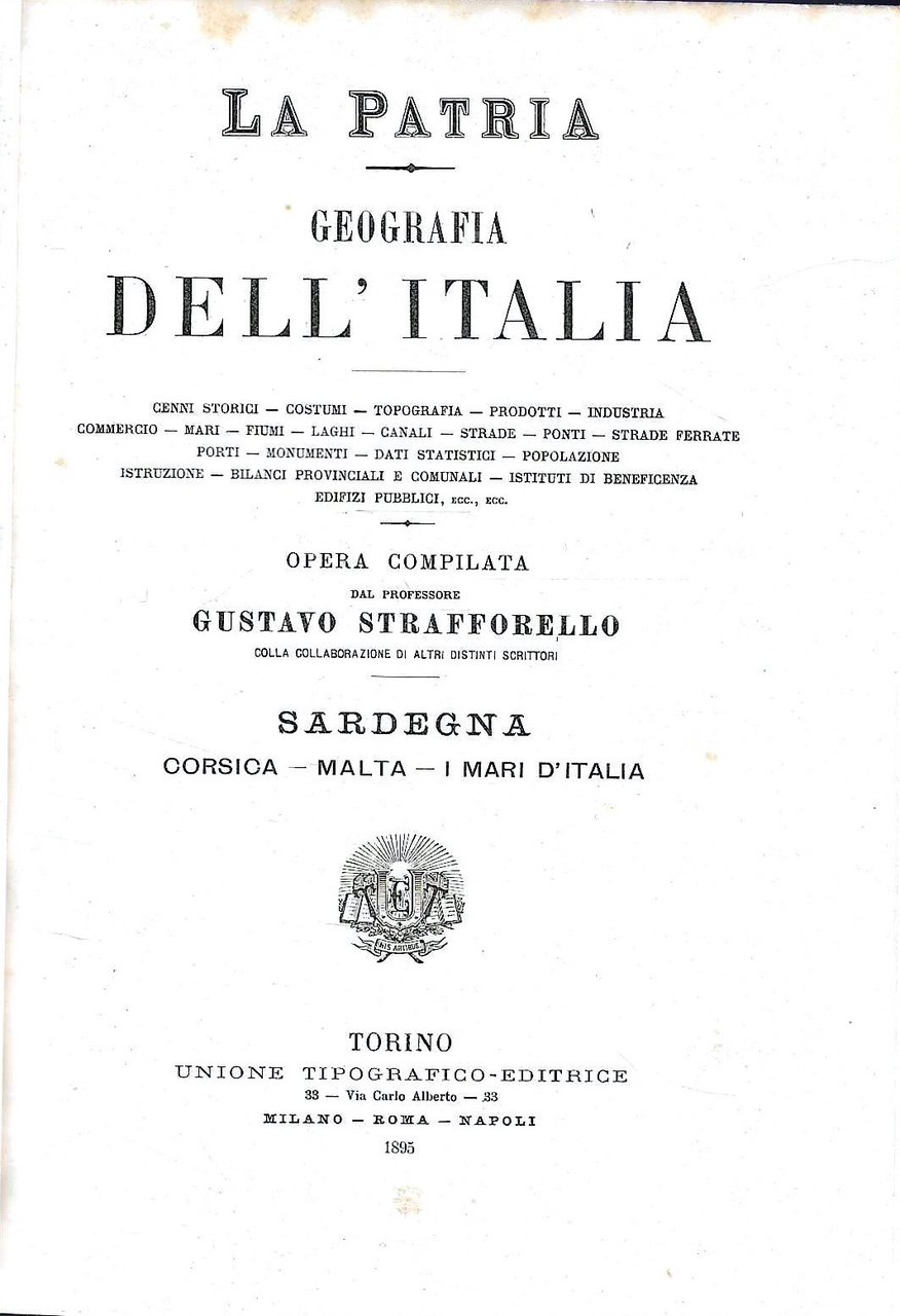 “La Patria - Geografia Dell' Italia: Cenni Storici, Costumi, Topografia, Prodotti, Industria Commercio, Mari, Fiumi, Laghi, Canali, Strade, Ponti, Strade Perrate Porti, Monumenti, Dati Statistici, Popolazione Istruzione, Bilanci Provinciali e Comunali, Istituti di beneficenza, Edifizi pubblici”,
