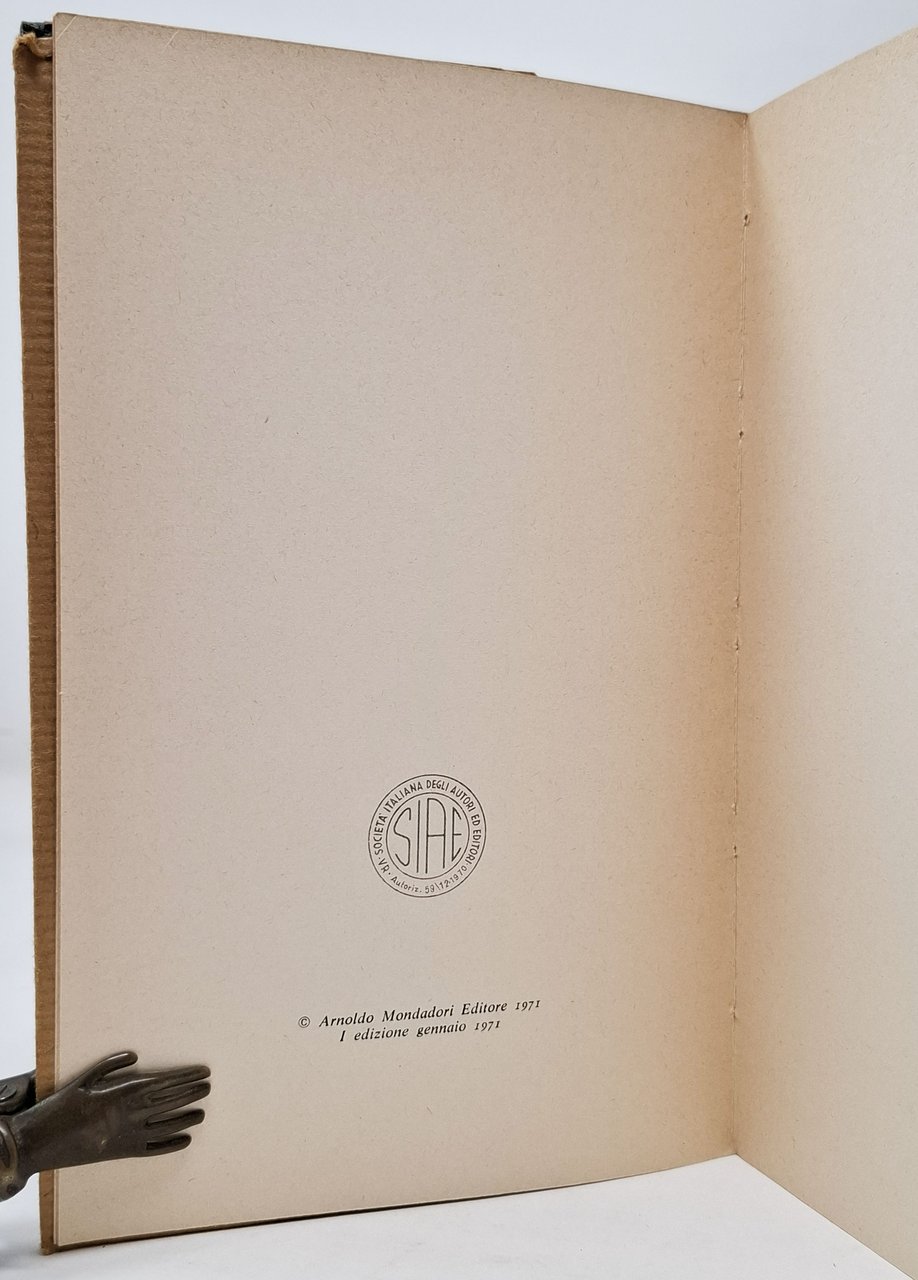 Collana: Lo Specchio / i poeti del nostro tempo. Prima edizione, gennaio 1971. Pagine: 155 + [17]. Formato: 13,5 x 20 cm circa. Stato di conservazione: piccoli strappetti con minuscole mancanze sui bordi della sovraccoperta ma, nel complesso un buon esemplare. Privo di firme, timbri, sottolineature o altri segni nel testo. Copertina editoriale flessibile con ampie alette e sovraccoperta in carta.
