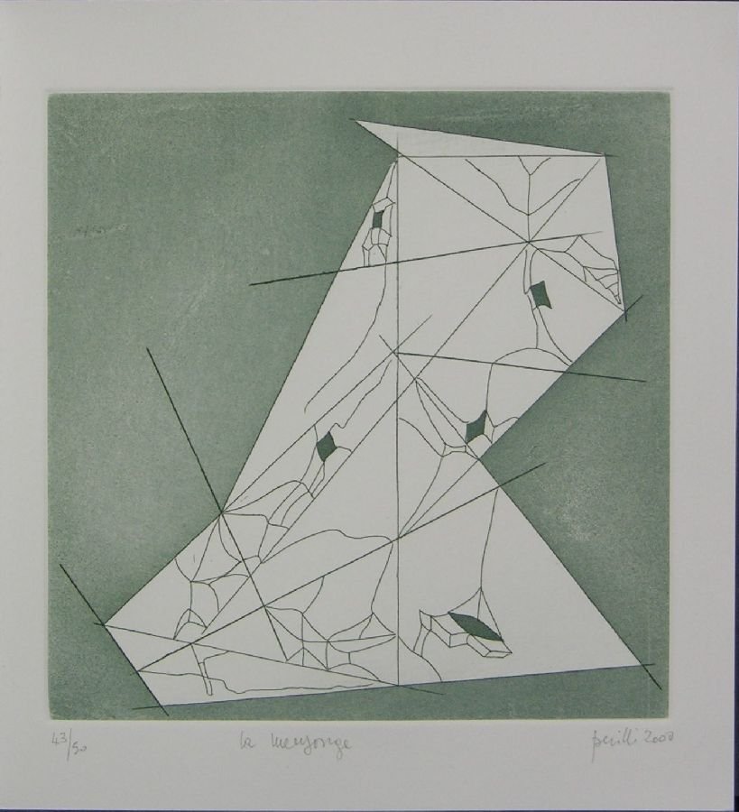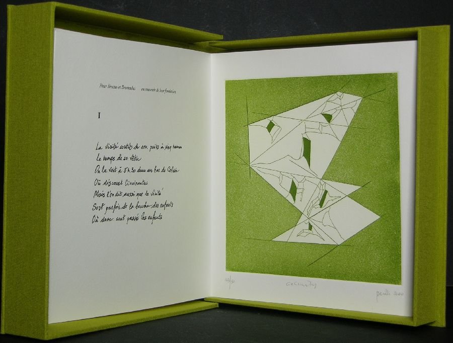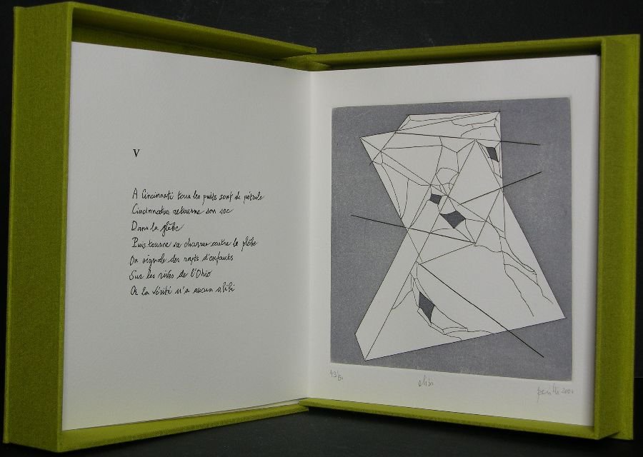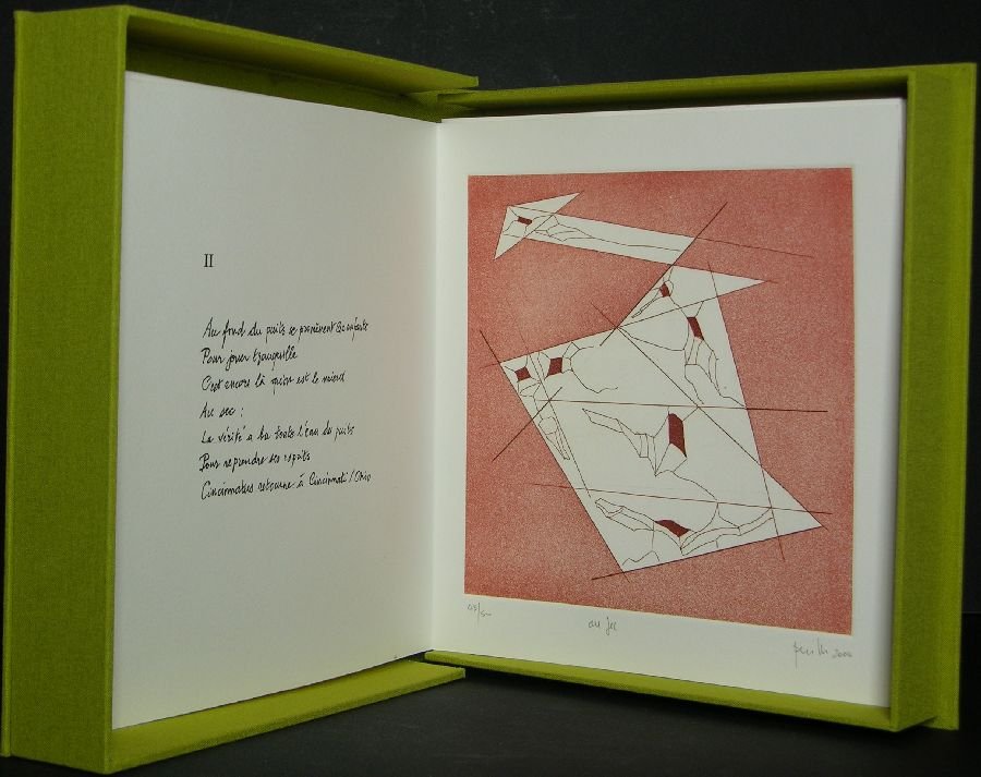 Sette acquaforti/acquatinte originali a colori (cm 18x18) di Achille Perilli, numerate e firmate. Sette poesie di Edouard Jaguer. La Librericciuola N. 14 Acqueforti incise su lastre di rame e tirate su torchio a mano da Luciano Trina, Roma. Lastre biffate dopo la tiratura. Carta Arches Velin Blanc. Testi stampati dallo Studio Tipografico AZ, Roma. Legatura in tela Brillianta di Sergio Bertoni, Roma. 8vo (cm 25 x 23). pp. 36. . Perfetto (Mint). . Prima ed. di 50+X es. numerati e firmati dagli A.. .