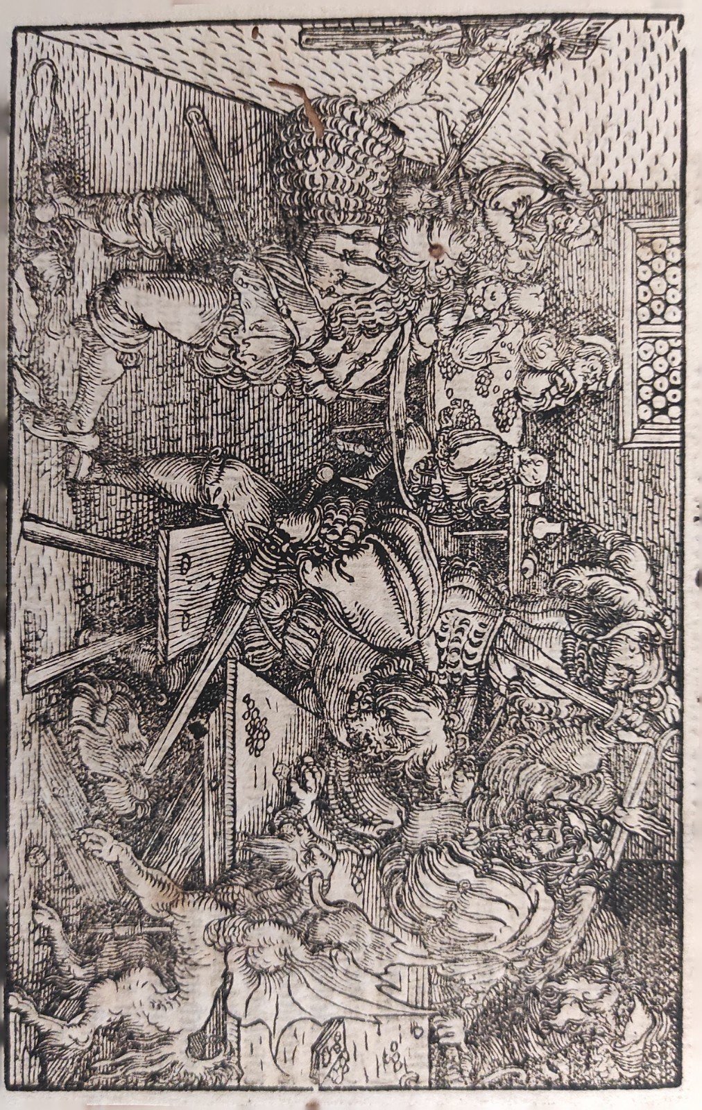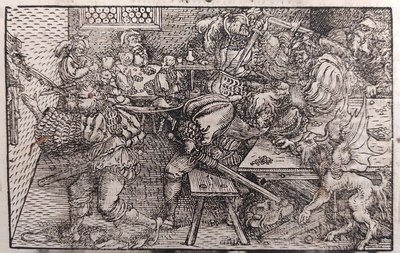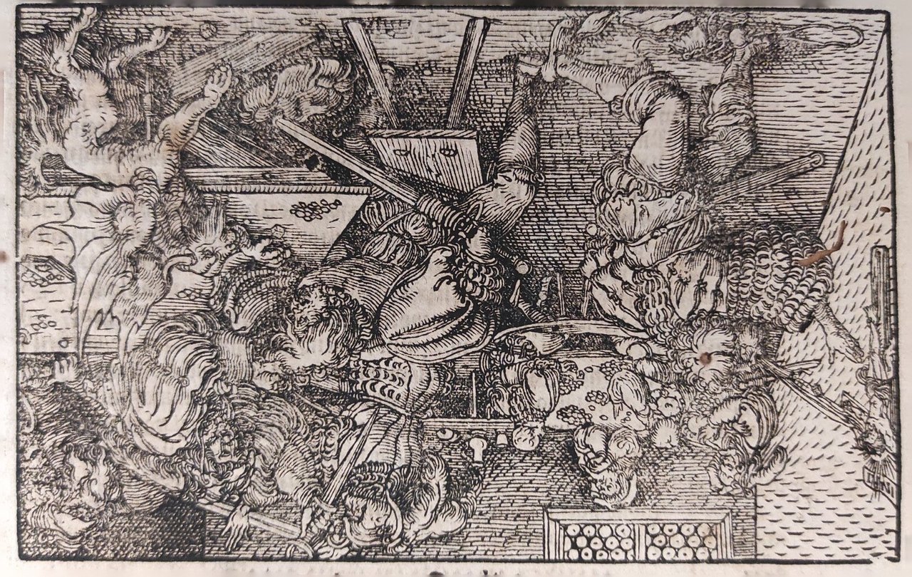 Hans Weiditz è considerato uno dei maestri della xilografia rinascimentale tedesca, insieme a Holbein,  Burgkmair e naturalmente Albrecht Dürer. Viene indicato come  "Il Maestro Petrarca" in ragione delle oltre 250 illustrazioni xilografiche da lui realizzate per il De Remediis Utriusque Fortunae di Petrarca.Quella qui proposta è una delle incisioni appartenenti a questa suggestiva raccolta. xilografia cm. 10,2 x 16 Buono (Good) Buon es., leggere macchie del tempo e fori sul lato sinistro.