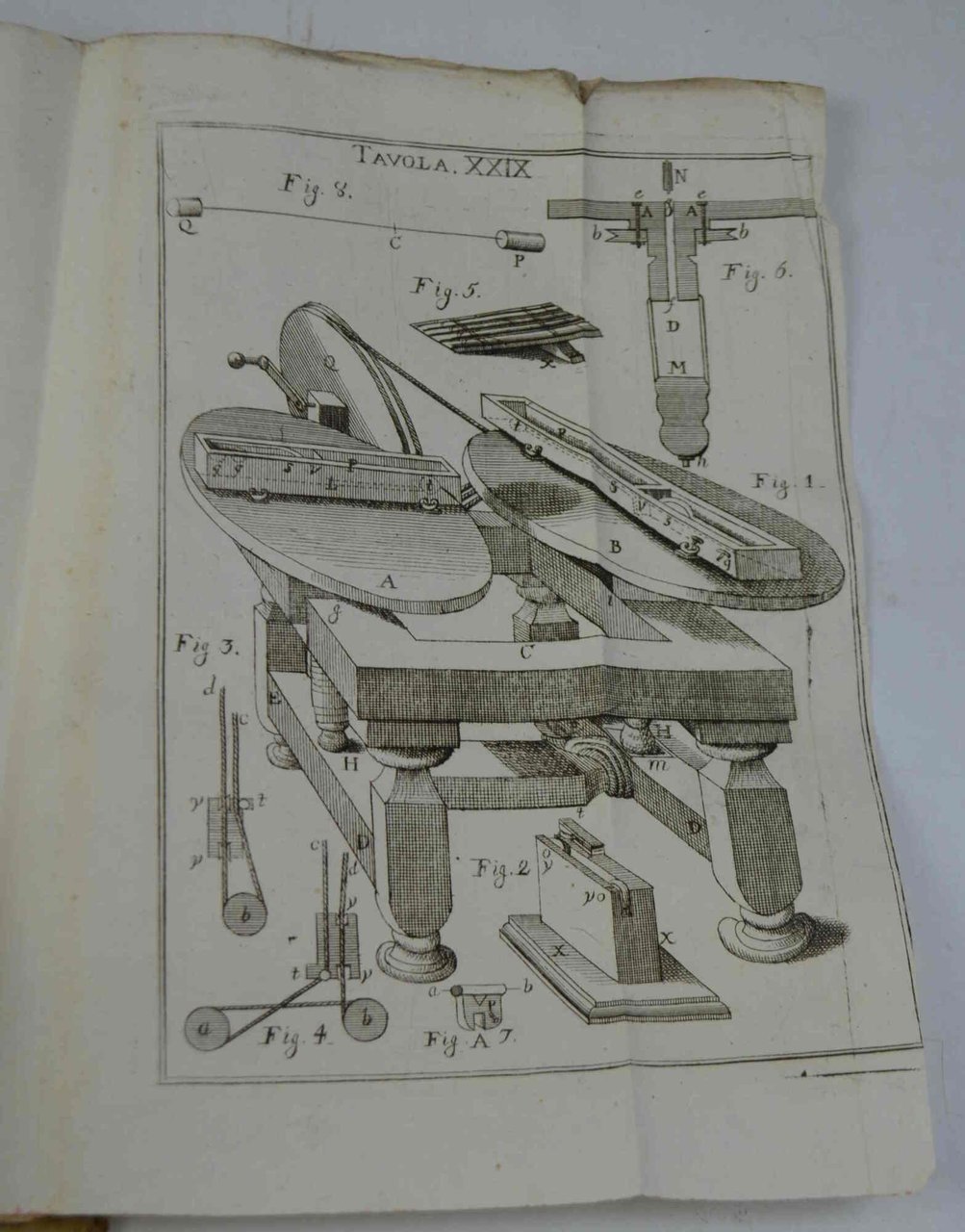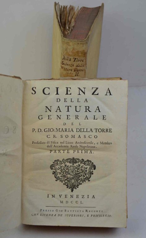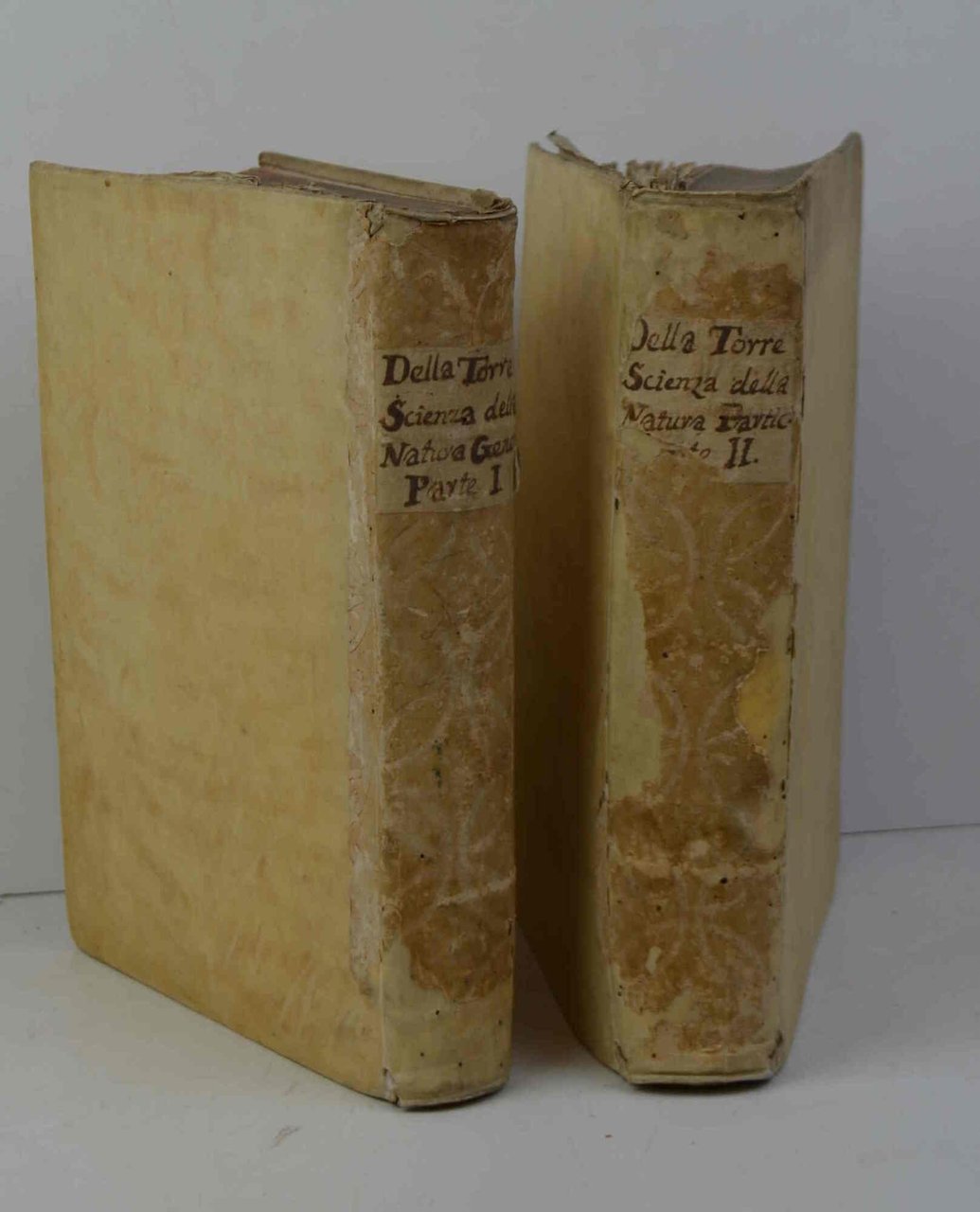 Due volumi di cm. 23,5, pp. xxiv, 436; (4) 600. Eleganti testate, capolettera figurati e 62 tavole incise in rame e ripiegate fuori testo. Legatura coeva in piena pergamena rigida con titoli manoscritti su tasselli ai dorsi. Esemplare genuino, ma con qualche traccia d'uso. Alcune tavole fuori posto, ma assolutamente completo. Interessante "summa scientifica" settecentesca. Il primo volume è dedicato prevalentemente a questioni di fisica, mentre il secondo spazia in vari campi della ricerca: geologia, studio sulla luce, microscopi, meteore, ecc. Riccardi vol. II n. 541; Boffito p. 135.