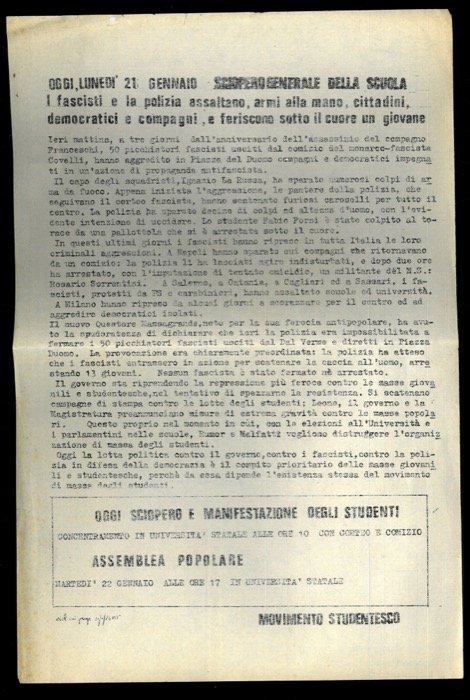 Sciopero generale della scuola. I fascisti e la polizia assaltano, armi alla mano, cittadini democratici e compagni, e feriscono sotto il cuore un giovane. | Libri antichi e moderni | Movimento Studentesco