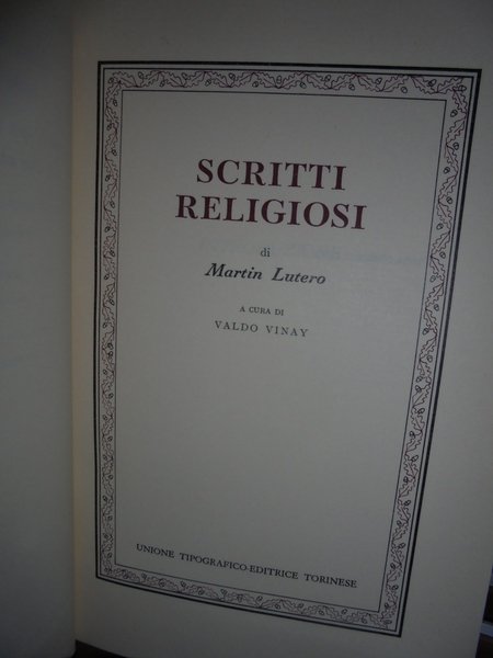 A cura di Valdo, Vinay. Torino, U.T.E.T., 1978. Scritti Religiosi di Martin Lutero. In-8°, tela edit. con fregi e titolo in oro al dorso, sovracopertina in acetato. 746 pp. con 9 tavole f.t. Esemplare come nuovo. Uff. TV. mob. nostro