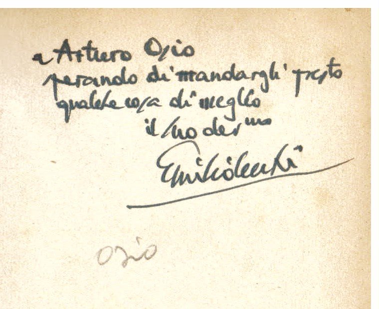 In-8°, pp. 301, (5), legatura m. pelle rossa con titolo e decori floreali in oro su dorso a nervetti. Piatti marmorizzati. Dedica autografa di Cecchi: 'A Arturo Osio sperando di mandargli presto qualche cosa di meglio il suo dev.mo Emilio Cecchi'. Il dedicatario è il famoso avvocato e banchiere, fondatore e primo presidente della Banca Nazionale del Lavoro. Brossura originale conservata. Qualche fioritura. Ottimo stato. Prima edizione. Spaducci, p. 84.