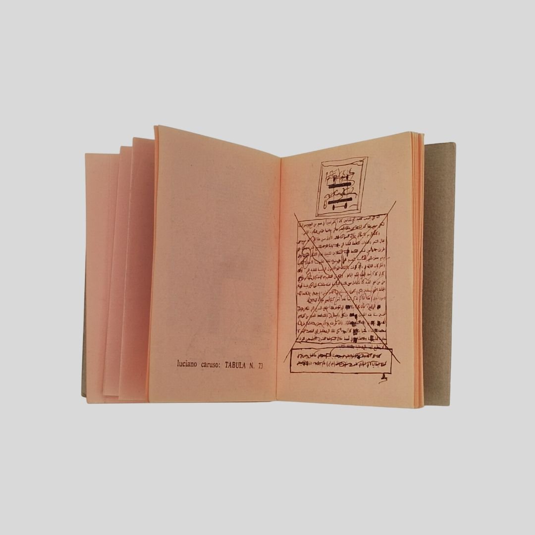 In-32, cm 7,8×6, pp. 14+22 n.n. tutte stampate su carta rosa. Una pagina ripiegata a fisarmonica (“ri/ASSUNTO”) e due illustrazioni in scala da grafiche di Luciano Caruso e Stelio Maria Martini. Molto raro. Luciano Caruso, Emilio Villa, Mario Diacono, Stelio Maria Martini. Collana I Lilliput Colonnese: poesia visiva e libro d’artista. «Stampato a Napoli nella tipografia “Contessa” per conto dell’editore Colonnese in duecento copie numerate e firmate dall’autore nel luglio del 1971». Esemplare sfuggito alla numerazione. Collana “I Lilliput”, n. 8.Contenuto VERTEX COELI, grafica di Luciano Caruso; méta mortphoses, poesia inedita di Emilio Villa <BR>HINDU’S TIAL DASEIgN, poesia di Mario Diacono datata 1966;<BR>ri/ASSUNTO di Luciano Caruso – nella carta ripiegata in quattro – datato 1965;<BR>una grafica senza titolo di Stelio Maria Martini; TABULA 73 di Luciano Caruso. Il volume rappresenta un momento interno alla riflessione teorica e operativa della collana, riunendo testi legati ad autori centrali del progetto. La struttura materiale, semplice ma non standard, riflette l’attenzione alla forma come elemento attivo del discorso. I Lilliput. La collana “I Lilliput”, ideata da Gaetano Colonnese in collaborazione con Luciano Caruso, rappresenta una delle prime esperienze editoriali italiane legate alla poesia visiva e alla ricerca sul rapporto tra parola e forma tipografica. La collana consta di 9 titoli editi in tiratura limitata: I Futuristi a tavola; Traitée de pédérasthie céleste; Da Finnegan’s Wake; Piccola Antologia della Poesia Spagnola d’Avanguardia; Totem étrangle; Lettres écrites à l’Abbé Nollet; Scritture e testi di Villa-Diacono-Martini; Formulazioni non-A; MDZ. Localizzazioni ICCU/SBN estremamente limitate, con titoli presenti in una o due sole biblioteche. Realizzata in formato estremamente ridotto, la collana non nasce come esercizio di miniaturizzazione, ma come scelta precisa: concentrare in pochi centimetri un progetto editoriale unitario. Carte differenti, inserti, piegature e variazioni tipografiche trasformano ogni volume in un oggetto autonomo, ma coerente con l’insieme. La presenza di autori come Villa, Artaud, Diacono, Martini e Caruso colloca la collana all’interno di <BR>una rete di ricerca che supera l’ambito nazionale, mantenendo una forte identità editoriale.<BR><BR><BR><BR><BR><BR><BR><BR><BR><BR><BR><BR><BR><BR><BR><BR><BR><BR><BR><BR><BR><BR><BR><BR><BR><BR><BR><BR><BR><BR><BR><BR><BR><BR><BR><BR><BR><BR><BR><BR><BR><BR><BR><BR><BR><BR><BR><BR><BR><BR><BR><BR><BR><BR><BR>I singoli titoli sono talvolta reperibili anche separatamente e presentano un interesse autonomo, sia per la presenza di autori di primo piano sia per le soluzioni editoriali adottate. Alcuni volumi, per caratteristiche materiali o per la loro limitata diffusione, risultano particolarmente ricercati anche singolarmente, pur trovando nella raccolta completa la piena espressione del progetto. “I Lilliput” si configura così come un progetto editoriale coerente, in cui ogni scelta — dal formato alla stampa — risponde a una visione precisa del libro.<BR><BR>Luciano Caruso (Foglianise, Benevento 1944–Firenze, 2002), formatosi a Napoli, è una delle figure centrali della ricerca verbo-visiva italiana del secondo Novecento. Fin dagli anni Sessanta sviluppa una pratica che unisce scrittura, immagine e riflessione teorica, maturata nel vivace ambiente culturale napoletano e alimentata dal confronto con le avanguardie italiane ed europee. L’incontro con Stelio Maria Martini e l’esperienza del gruppo Linea Sud evolvono nel 1967 nella fondazione di Continuum, spazio di sperimentazione e confronto che segna un passaggio decisivo verso una concezione del testo come struttura visiva e materiale, oltre che linguistica.<BR><BR>In questi stessi anni prende forma il rapporto con Gaetano Colonnese, con il quale Caruso sviluppa un progetto editoriale coerente e riconoscibile: la collana “I Lilliput” (1969–1972). Qui il libro diventa oggetto progettato, dove formato, supporti, impaginazione e stampa partecipano attivamente alla costruzione del significato. All’interno di questo contesto va collocato Formulazioni non-A di Stelio Maria Martini.<BR><BR>Sebbene l’opera sia concepita all’inizio degli anni Sessanta (da cui deriva la data talvolta indicata come 1963), la sua realizzazione editoriale avviene nel gennaio 1972 per i tipi di Colonnese, in piena coerenza con l’attività di Continuum e con il sodalizio Caruso–Colonnese. Il volume, non destinato alla distribuzione commerciale, rappresenta quindi un momento interno e sperimentale della collana, più che un episodio isolato. L’attività di Caruso proseguirà poi tra editoria, critica e sperimentazione artistica, con un ruolo rilevante anche nella riscoperta del Futurismo e nella promozione dei libri d’artista, mantenendo sempre una concezione dell’arte come pratica aperta, interdisciplinare e non convenzionale.