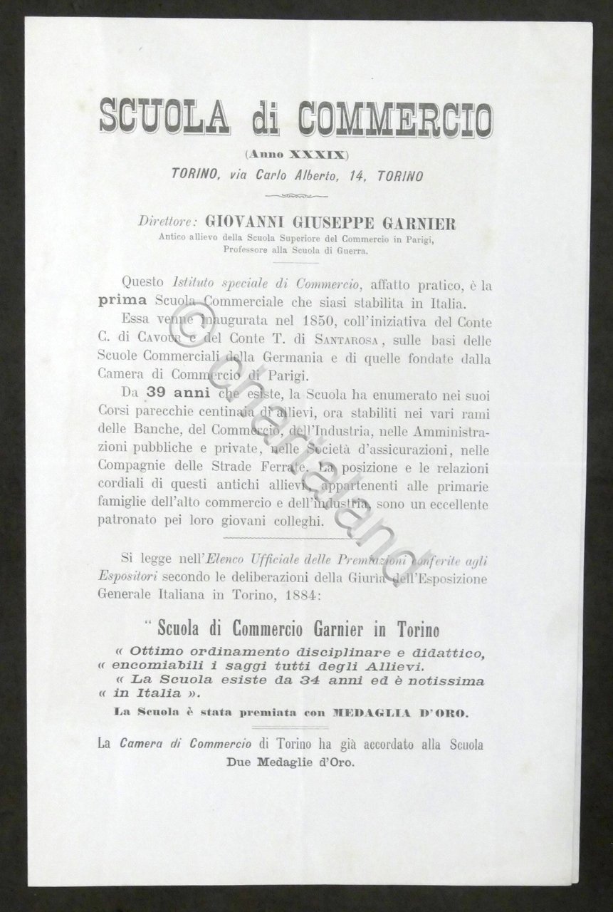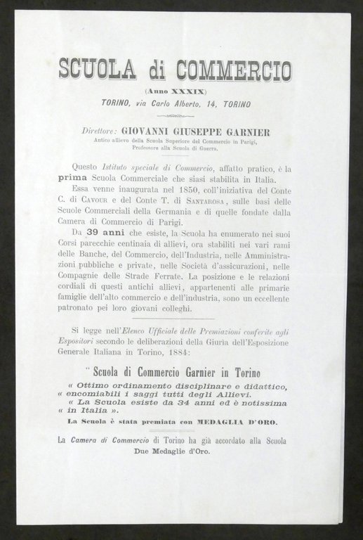 Scuola di Commercio Giovanni Giuseppe Garnier in Torino - Informazioni - 1884 | Libri antichi e moderni |