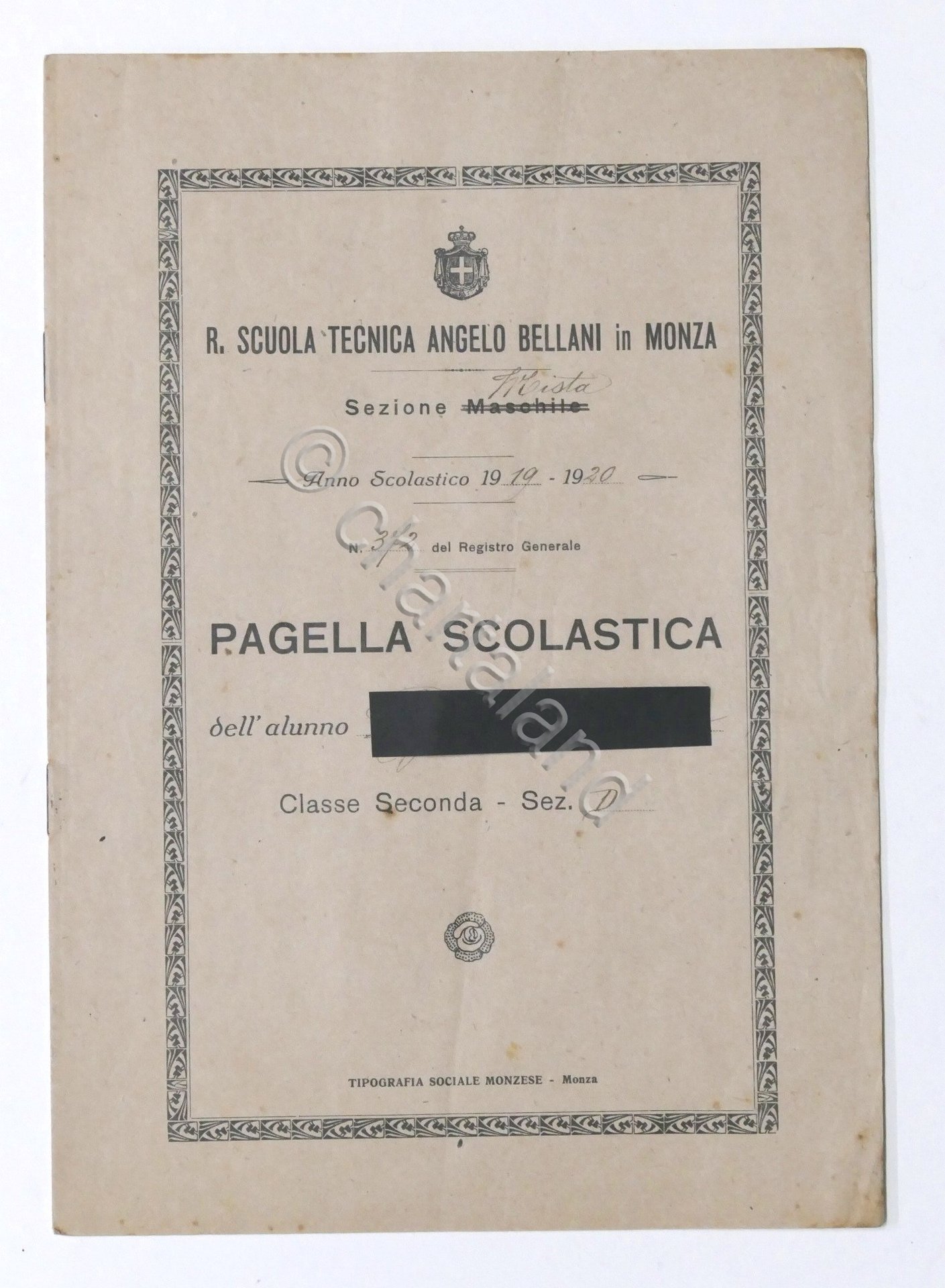 Scuola Tecnica Bellani in Monza - Pagella Classe 2^ - Anno 1919 - 1920 | Libri antichi e moderni |