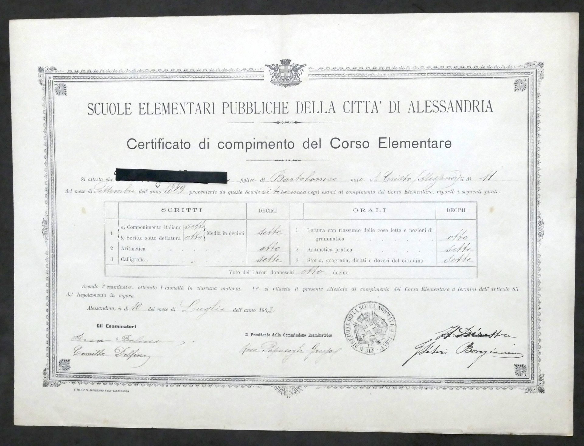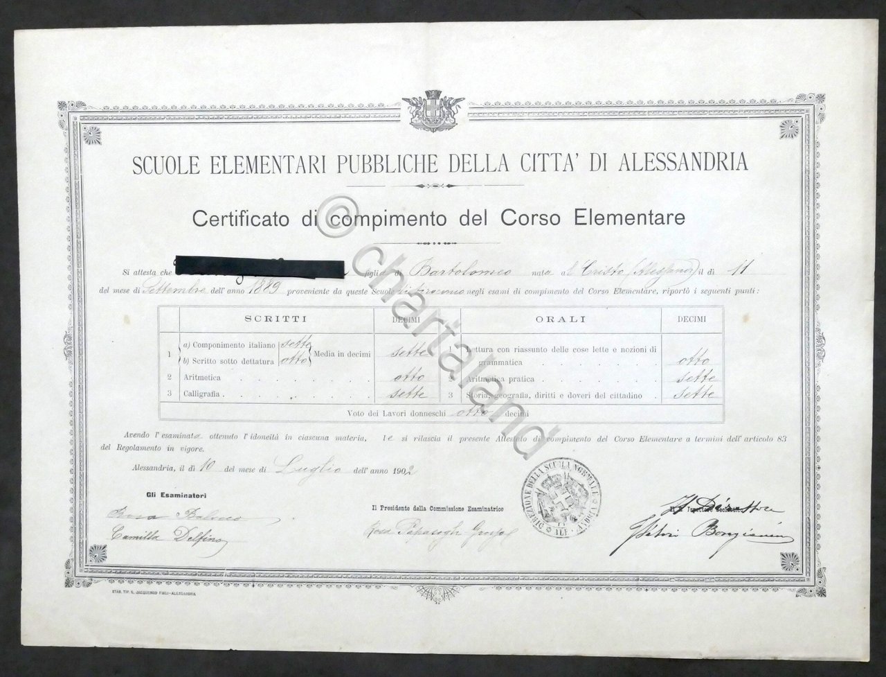 Scuole Elementari di Alessandria - Certificato Compimento Corso Elementare 1902