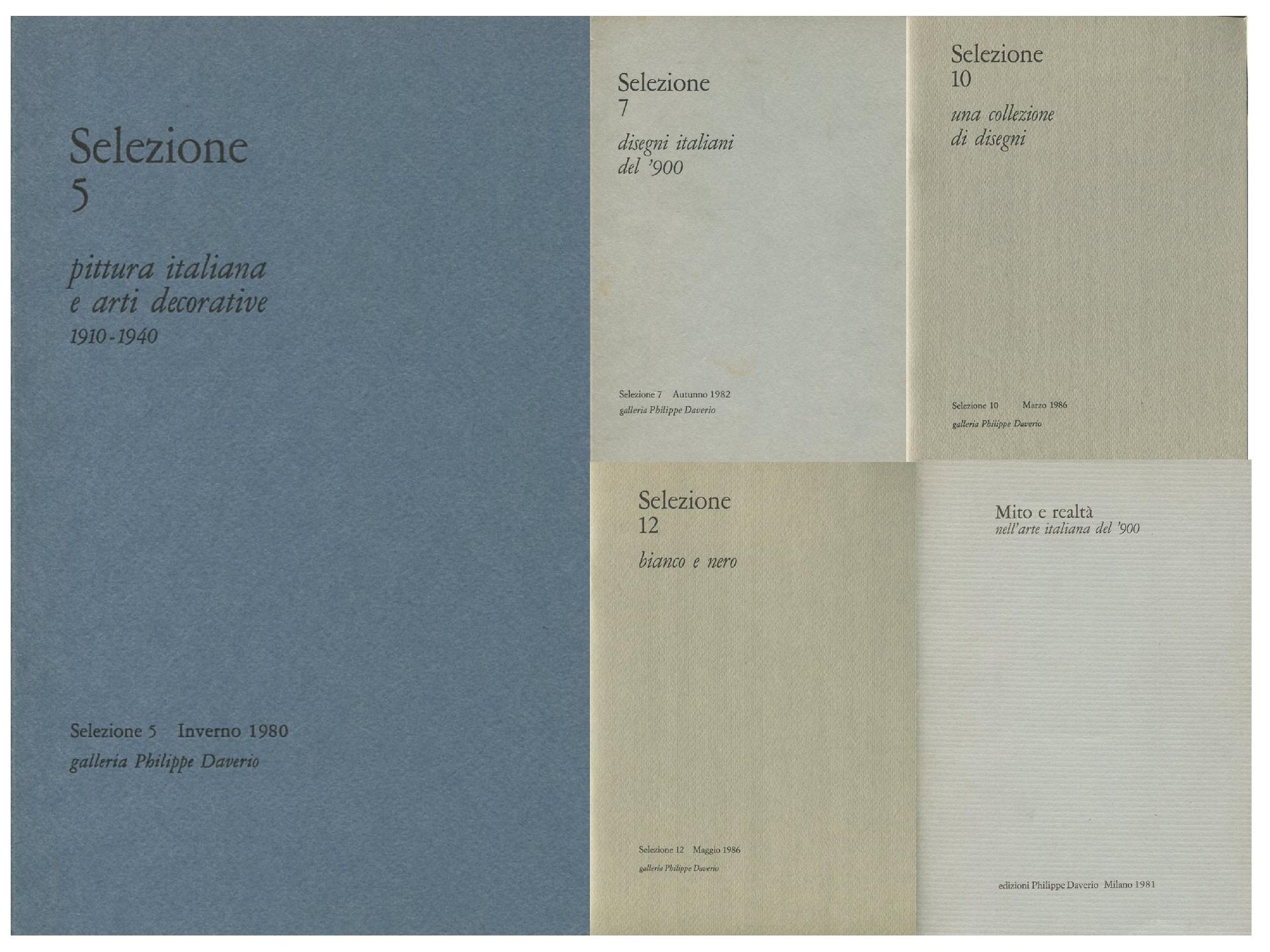 . 8vo. pp. 58 non numerate. . Ottimo (Fine). . . . Si aggiungono della GALLERIA PHILIPPE DAVERIO 4 cataloghi: Selezione 7. Disegni italiani del '900 (Autunno 1982. Catalogo di mostra, Milano. Con 41 tavole in bianco e nero e descrizione delle opere di: Giacomo Balla, Luigi Bartolini, Umberto Boccioni, Massimo Campigli, Carlo Carrà, Giorgio De Chirico, Filippo De Pisis, Lucio Fontana, Achille Funi, Mario Mafai, Giorgio Morandi, Enrico Prampolini, Ottone Rosai, Scipione, Gino Severini, Mario Sironi. Pagine 92) - Selezione 10. Una collezione di disegni (Marzo 1986. Catalogo di mostra, Milano. Con 25 tavole in bianco e nero. Opere di: Andrea Appiani, Mosè Bianchi, Gustav Klimt, Romolo Romani, Gino Severini, Virgilio Marchi, Fortunato Depero, Mario Sironi, Ubaldo Oppi, Giorgio Morandi, Giorgio De Chirico, Alberto Savinio, Scipione, Mario Mafai, Pericle Fazzini, Alberto Ziveri, Antonietta Raphael Mafai, Giacomo Manzù. Pagine 30) - Selezione 12. Bianco e nero (Maggio 1986. Catalogo di mostra, Milano. Con 28 tavole in bianco e nero: 16 grafiche e 12 fotografie. Opere di Edvard Munch, Paul Cézanne, Pierre Bonnard, Edouard Vuillard, Pablo Picasso, Georges Braque, Arturo Martini, Alberto Martini, Robert Delaunay, Felice Casorati, Adolfo Wildt, Giorgio Morandi, Luigi Bartolini, Giuseppe Viviani, Maurits Cornelius Escher, Alberto Giacometti, William Henry Fox Talbot, Oscar Gustav Rejlander, Hugh Diamond, Lewis Carroll, Heinrich Kuhn, Wilhelm Von Gloegen, Franz Roh, Laszlo Moholy-Nagy, Eliazar El Lissitzky, Man Ray, Mario Gabino. Pagine 40) - Mito e realtà nell'arte italiana del '900 (Catalogo di mostra, Milano 1981. Testo di Paolo Baldacci. Con 17 illustrazioni in bianco e nero delle opere di Baccio Maria Bacci, Mario Broglio, Cagnaccio di San Pietro, Carlo Carrà, Giorgio De Chirico, Achille Funi, Piero Marussig, Arturo Martini, Gregorio Sciltian, Mario Sironi, Mario Tozzi, Guido Trentini. Pagine 40)