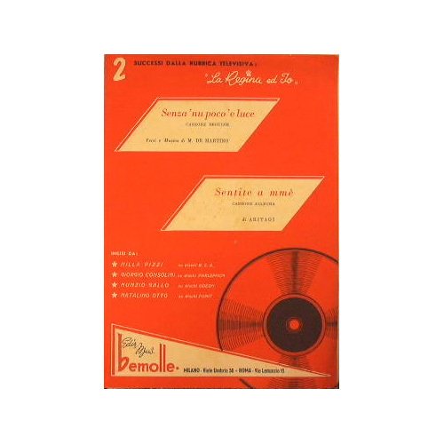 Due successi dalla rubrica televisiva ' La regina ed io ' - Incisi da Nilla Pizzi, Giorgio Consolini, Nunzio Gallo e Natalino Otto - Contiene i testi delle canzoni - in 8° - pp.17 - Brossura editoriale illustrata - Partitura per Pianoforte, Saxofono Contralto, Saxofono Tenore, Tromba, Violino/Fisarmonica e Contrabbasso