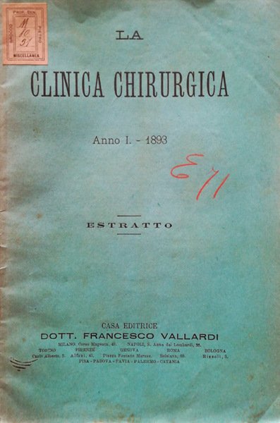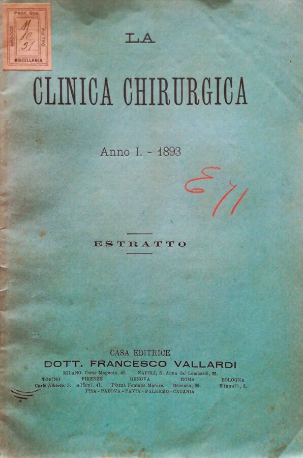 La Clinica Chirurgica, anno I - 1893 - Estratto, n. 8. "Sepsis, setticemia, pioemia" comunicazioni della Clinica Chirurgica Propedeutica di Camerino, diretta dal Prof. A. Salomoni. Lezioni raccolte dallo studente Concetti. Fascicolo spillato in cartoncino in buone condizioni, ma che presenta: ingiallimento, macchie del tempo e bordi leggermente usurati. Il piatto anteriore presenta un'etichetta di precedente possessore ed un'annotazione con matita colorata. Le pagine sono leggermente brunite e riportano marcata fioritura. Pagine da 21 a 24 tagliate all'estremità superiore, ma perfettamente leggibili. Numero pagine 28.