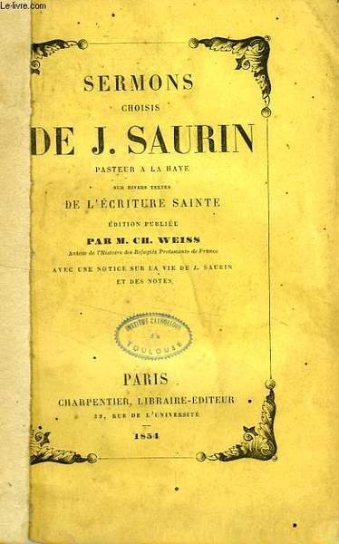 Charpentier, Libraire-Editeur, Paris. 1854. In-12 Carré. Broché. Etat d'usage. Couv. convenable. Coiffe en tête abîmée. Quelques rousseurs. 459 pages. Papier muet et étiquette de code collés sur le dos. Tampons de bibliothèque sur le 1er plat et en page de titre. J. Saurin, Pasteur à La Haye. Edition publiée et annotée par M. Ch. Weiss. Avec une Notice sur la vie et les écrits de J. Saurin.