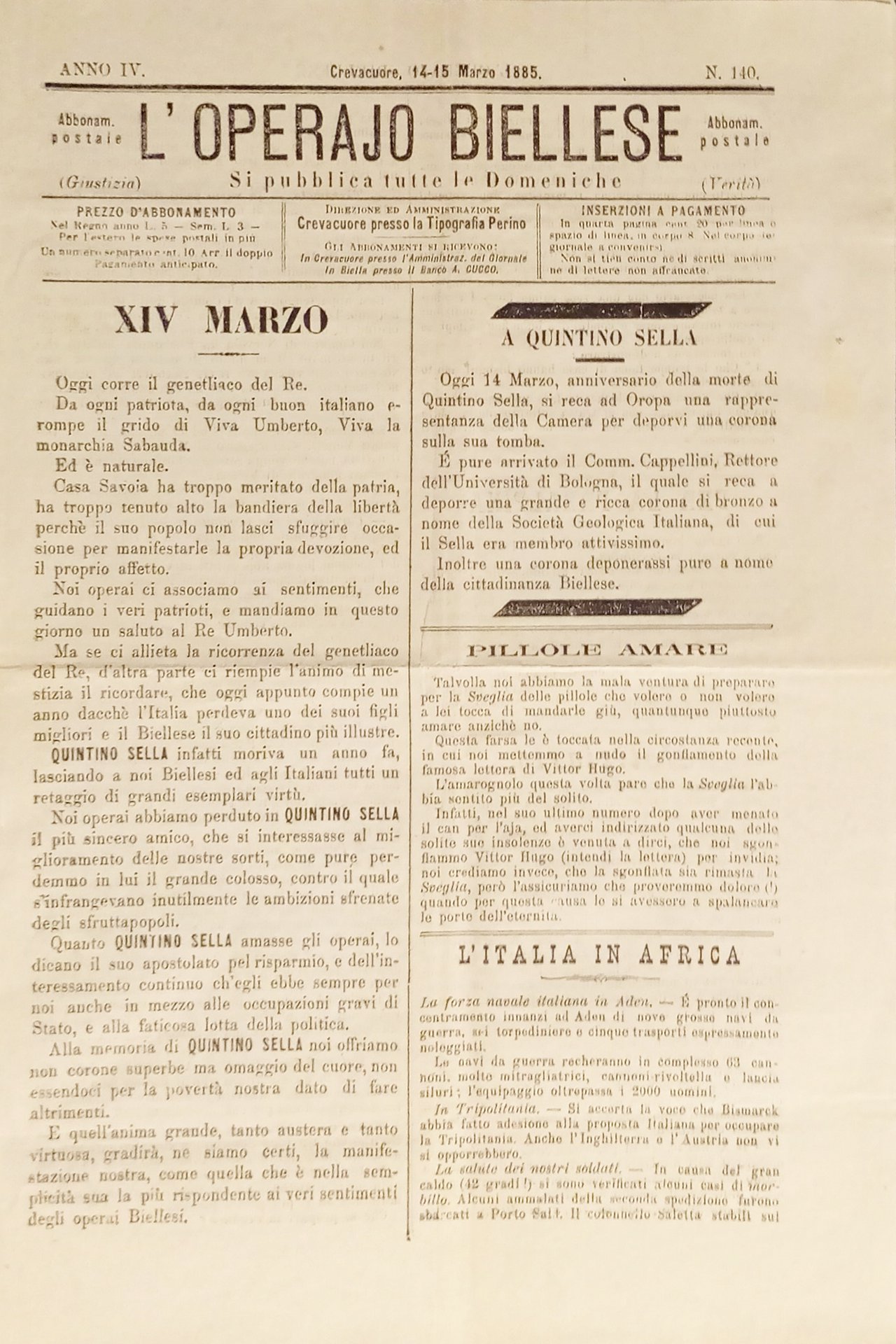 Settimanale - L'Operaio Biellese N. 140 - 1885 L'Italia in Africa