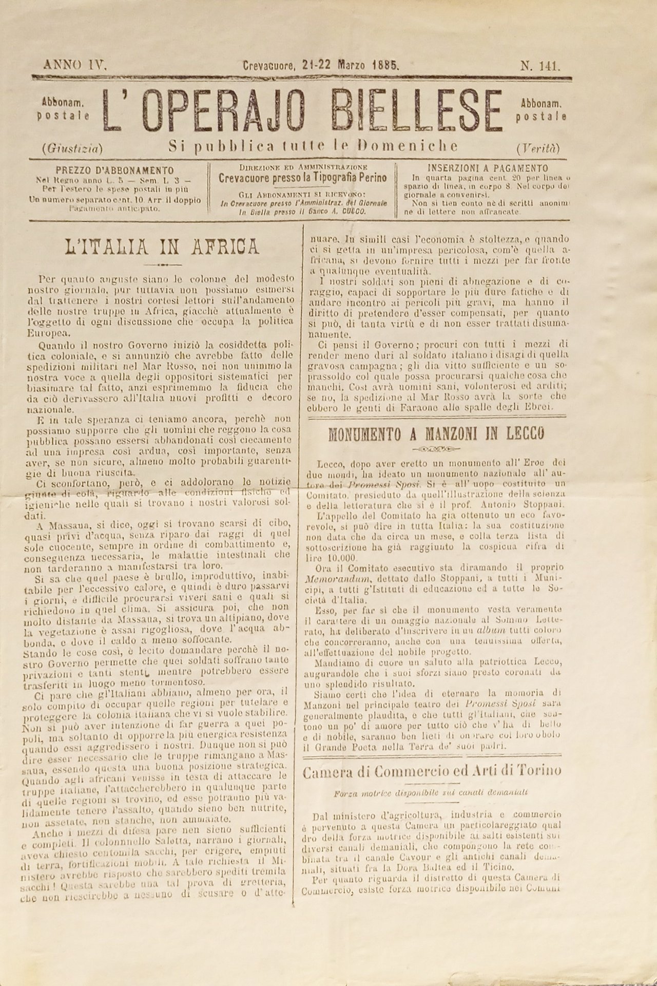 Settimanale - L'Operaio Biellese N. 141 - 1885 Monumento a Manzoni in Lecco