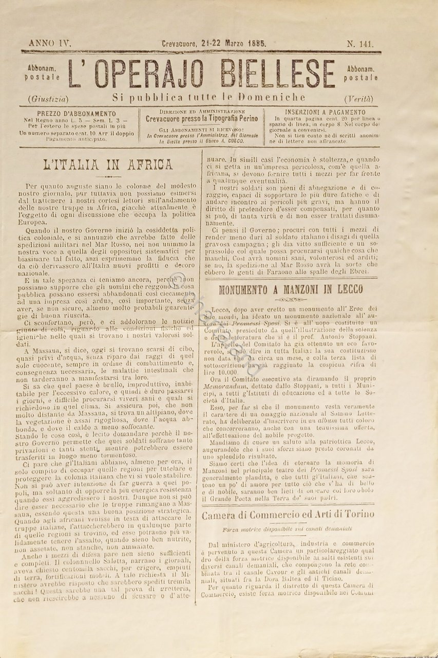 Settimanale - L'Operaio Biellese N. 141 - 1885 Monumento a Manzoni in Lecco | Libri antichi e moderni |