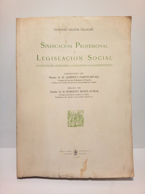 Sindicación Profesional y Legislación Social a través de la Historia, la Doctrina y los Continentes / Introducción del Sr. D. Alberto Martín-Artajo; epílogo del Sr. D. Rodolfo Reyes Ochoa | Libri antichi e moderni | Villena Villalain, Francisco
