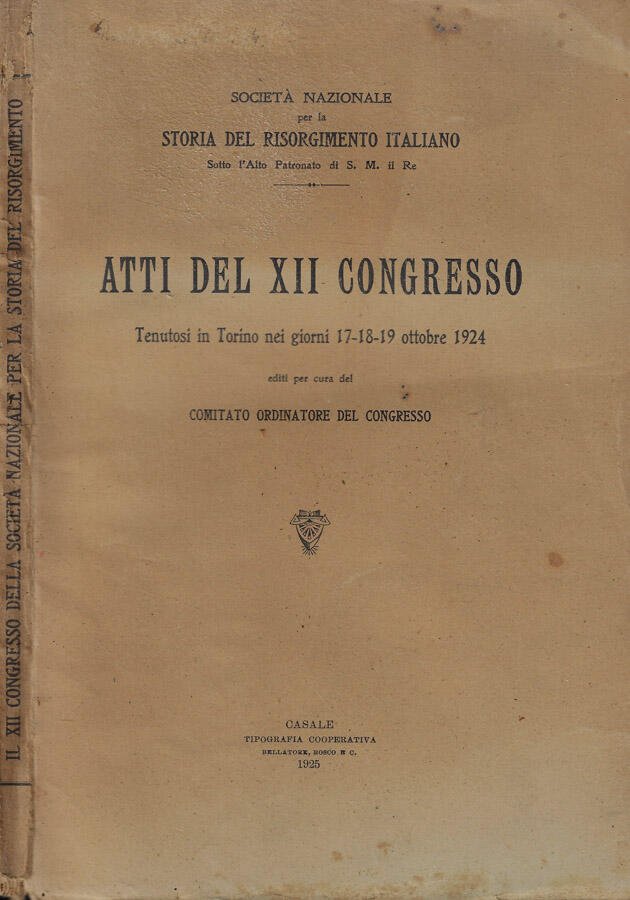Atti del XII Congresso tenutosi in Torino il 17-18-19 ottobre 1924 ed editi per cura del Comitato Ordinatore del Congresso. Brossura in cartoncino, scurita e segnata dal tempo, con strappetti ed usura lungo i margini e con qualche piccola gora. Pagine ingiallite, con tagli irregolari, ampio margine e qualche lieve gora. Numero pagine 152.