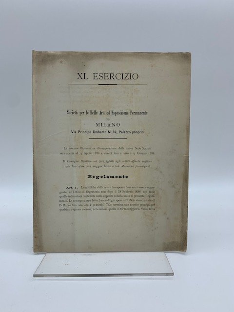 In 8, cm 18 x 23,5, pp. 8. Privo di brossura all'origine. Importante e raro documento varato dalla neonata associazione che sorse dalla fusione della Societa' per le belle arti e dalla Societa' permanente di belle arti, riconosciuta come Ente morale da Umberto I il 22 settembre 1884. In esso viene annunciata la solenne esposizione di inaugurazione della nuova sede sociale ( il Palazzo venne costruito appositamente su disegno dell'Architetto Beltrami) che avrebbe avuto luogo tra il 15 aprile e il 15 giugno 1886 e di questa viene pubblicato il regolamento