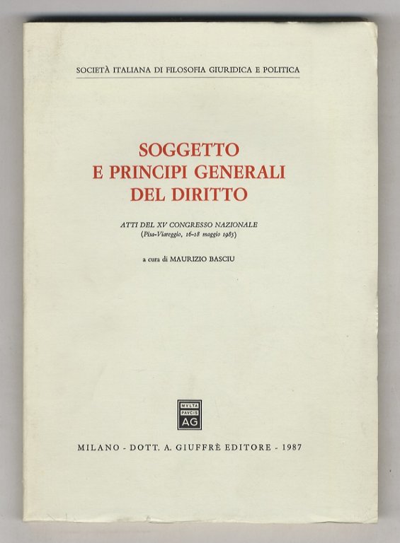 Soggetto e principi generali del diritto. Atti del XV Congresso nazionale (Pisa-Viareggio, 16-18 maggio 1985). | Libri antichi e moderni | Basciu Maurizio,.