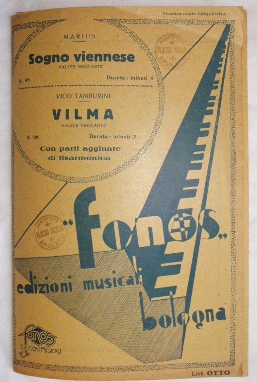 In 8. cm 27x17,5. Pp. 22. Partitura completa per orchestra del 1934 di due canzoni, tiratura 5000 copie. Caratteristica copertina decorata dell'epoca. Ex libris sulla copertina. Ottime condizioni. A complete score for orchestra of 1934, 5000 copies. Carachteristic decorated cover of that period. Ex libris in the cover. Very good conditions.