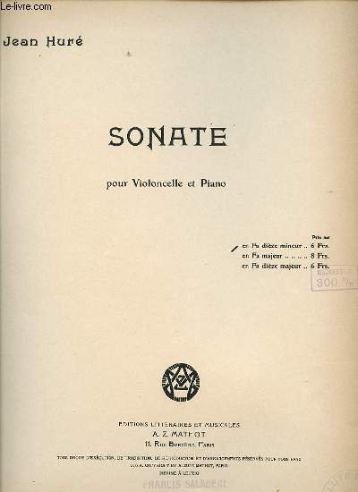 SONATE POUR VIOLONCELLE ET PIANO. | Libri antichi e moderni | Jean Hure.