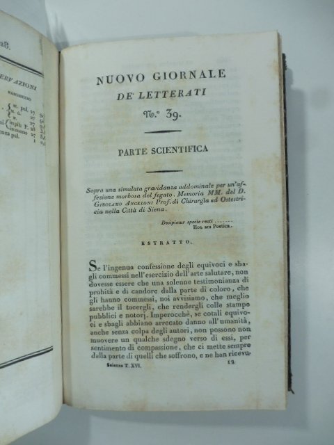 Sopra una simulata gravidanza addominale per un'affezione morbosa del fegato. Memoria MM del D. Girolamo Andreoni.Siena. (Stralcio da: Nuovo giornale de' letterati. N. 39. 1828) | Libri antichi e moderni | Anonimo