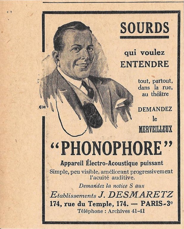 Sourds qui voulez entendre Phonophore. Et J. Desmaretz. Pubblicita 1926