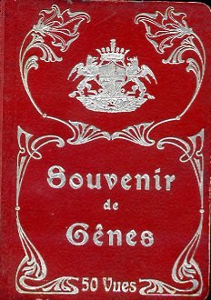 Album leporello in-16° in legatura editoriale in t. tela rossa con titolo, stemma di Genova e decori floreali e vegetali stilizzati in argento al piatto. 50 vedute fotografiche ripiegate a fisarmonica. Pianta di Genova a colori al contropiatto posteriore. Ottimo stato.