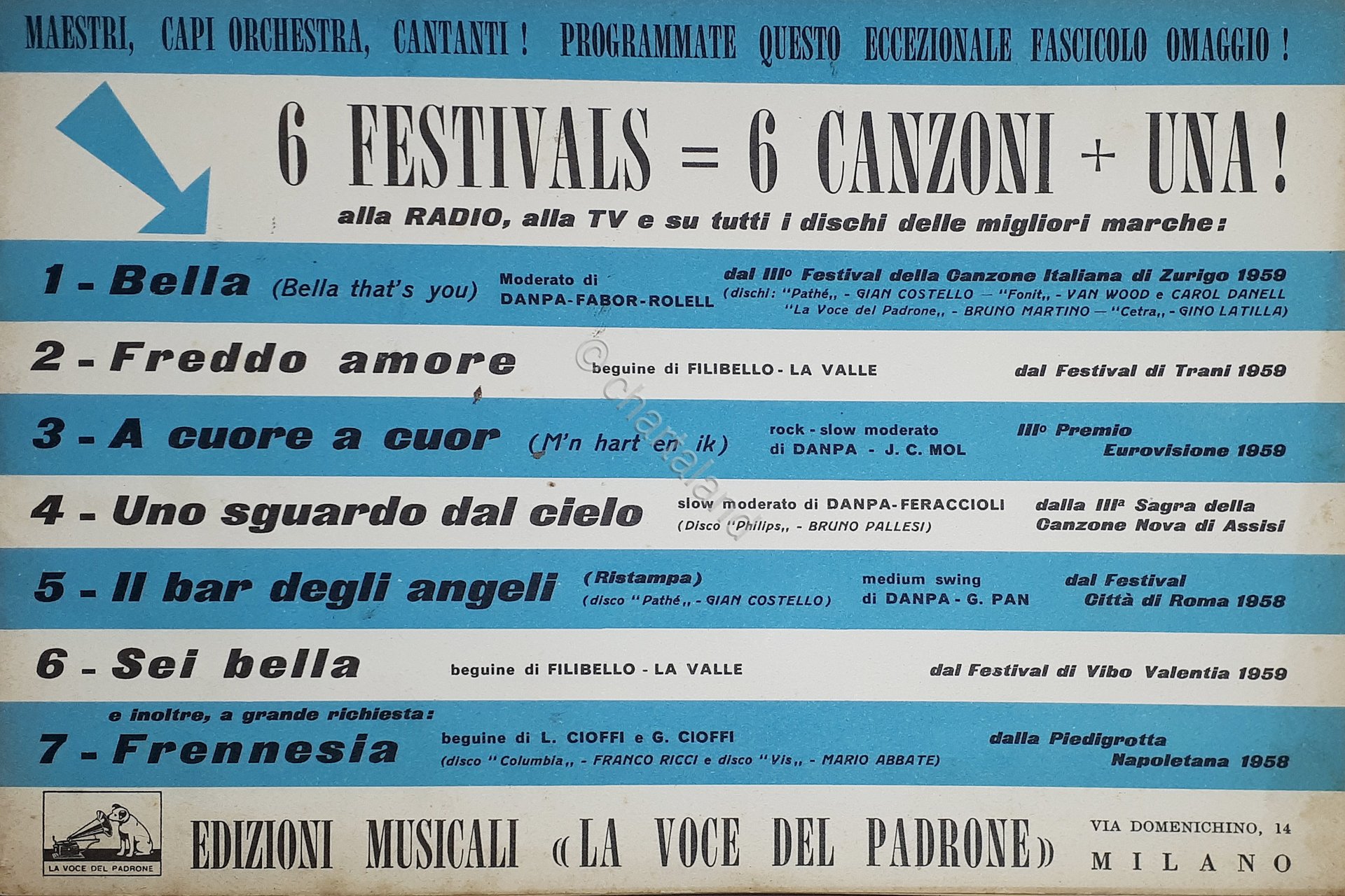 Spartiti - 6 Festivals = 6 Canzoni +Una!: Bella - Freddo cuore - A cuore a cuor - Uno sguardo al cielo - Il bar degli angeli - Sei bella - Frennesia - 1959 Testo in lingua italiana Pagine - 40 Condizioni molto buone