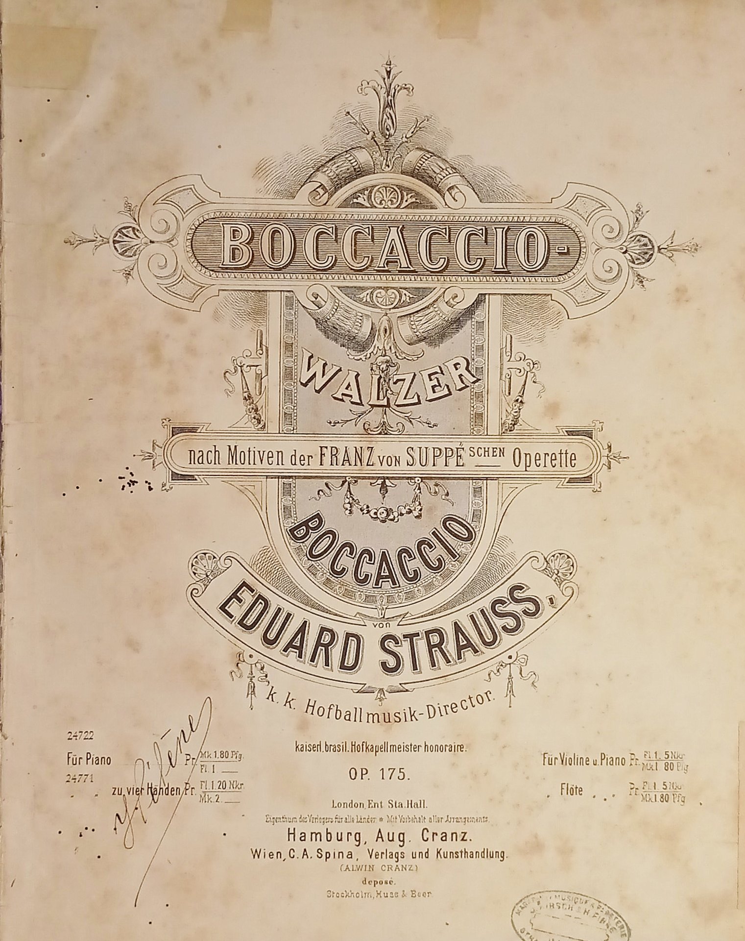 Spartiti - Boccaccio - Walzer von Eduard Strauss - Op. 175 - Pianoforte Formato grande. Pagine 11 Condizioni buone con piccoli segni del tempo come da foto.