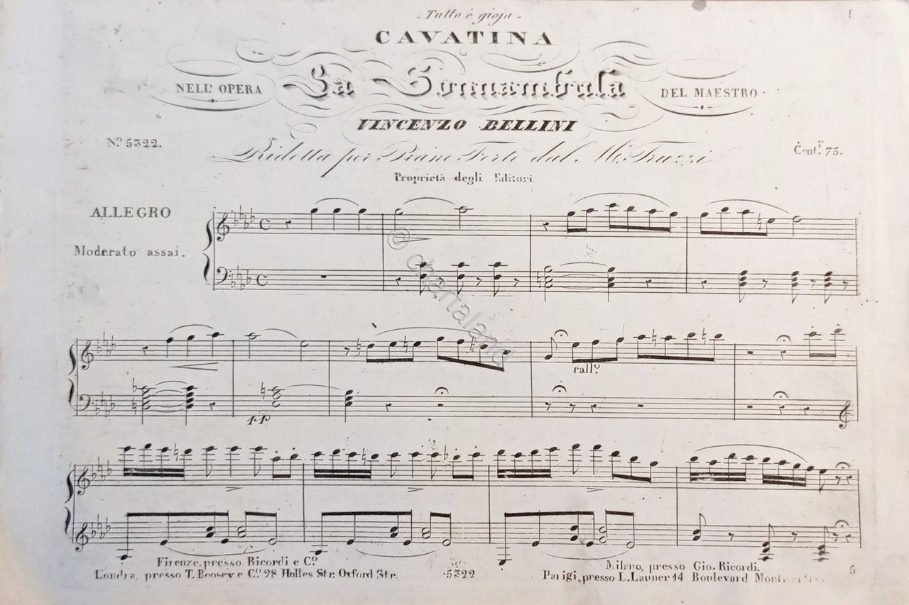 Spartiti - Cavatina nell'Opera La Sonnambula di V. Bellini per Pianoforte