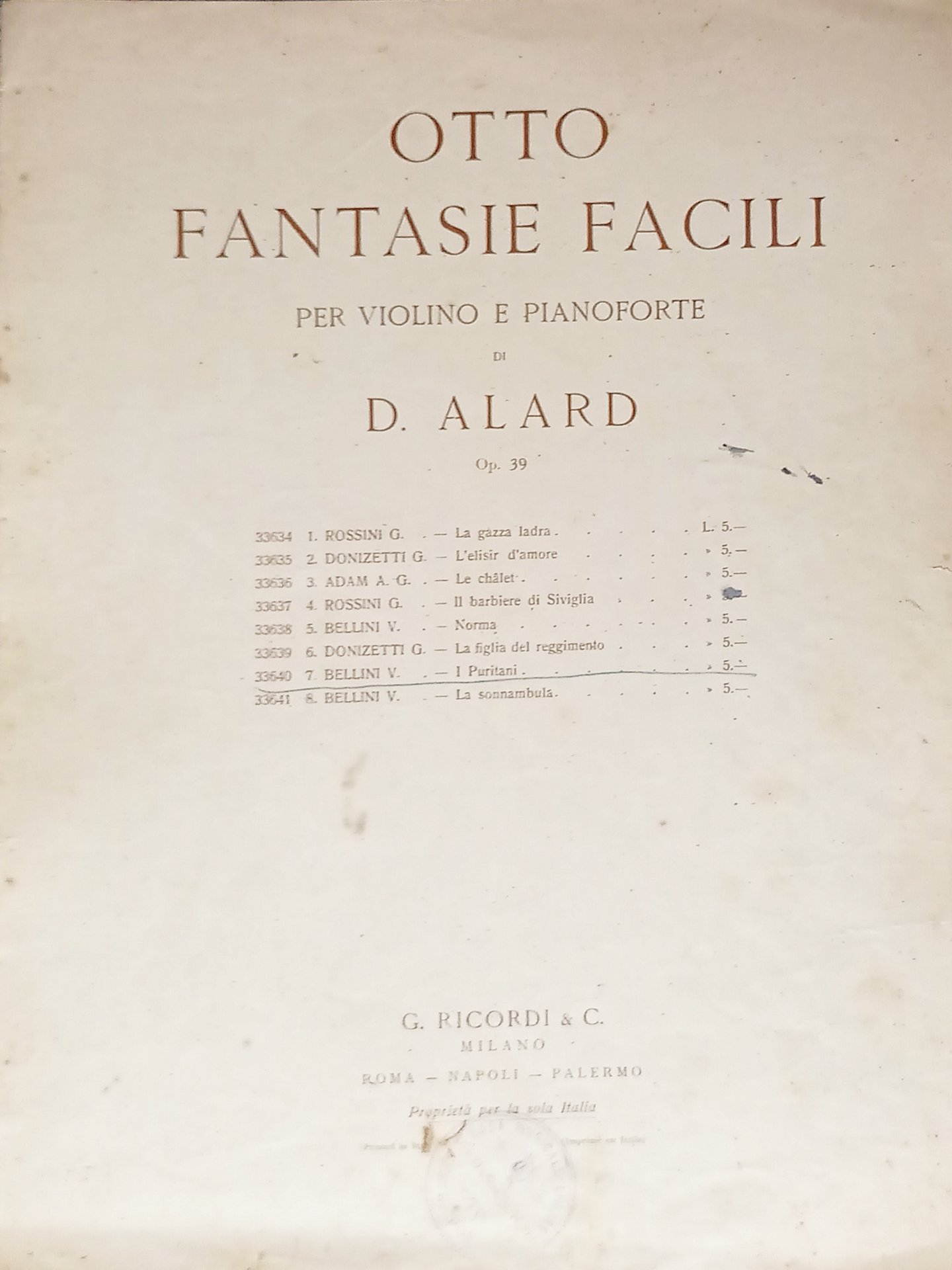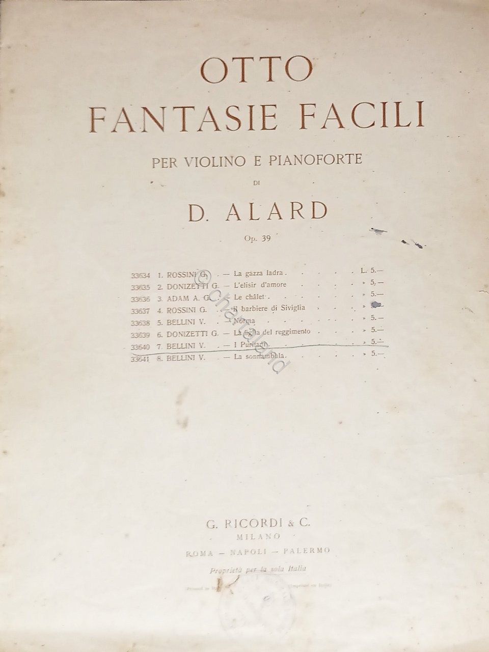 Spartiti - I Puritani di V. Bellini - Fantasia Facile per Violino di D. Alard | Libri antichi e moderni |