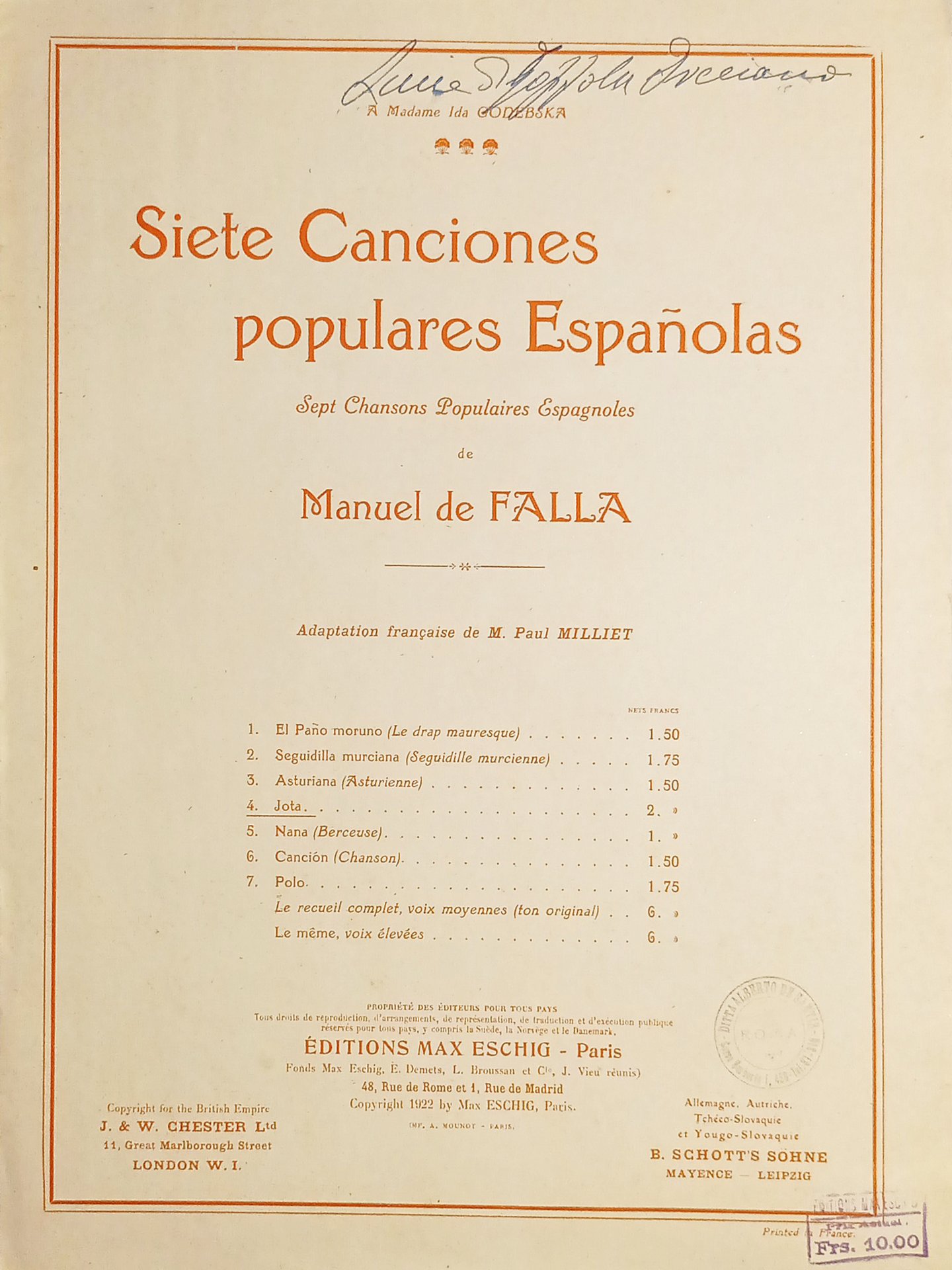 Spartiti - Jota - Canciones populares Espanolas de Manuel De Falla - 1922 | Libri antichi e moderni |