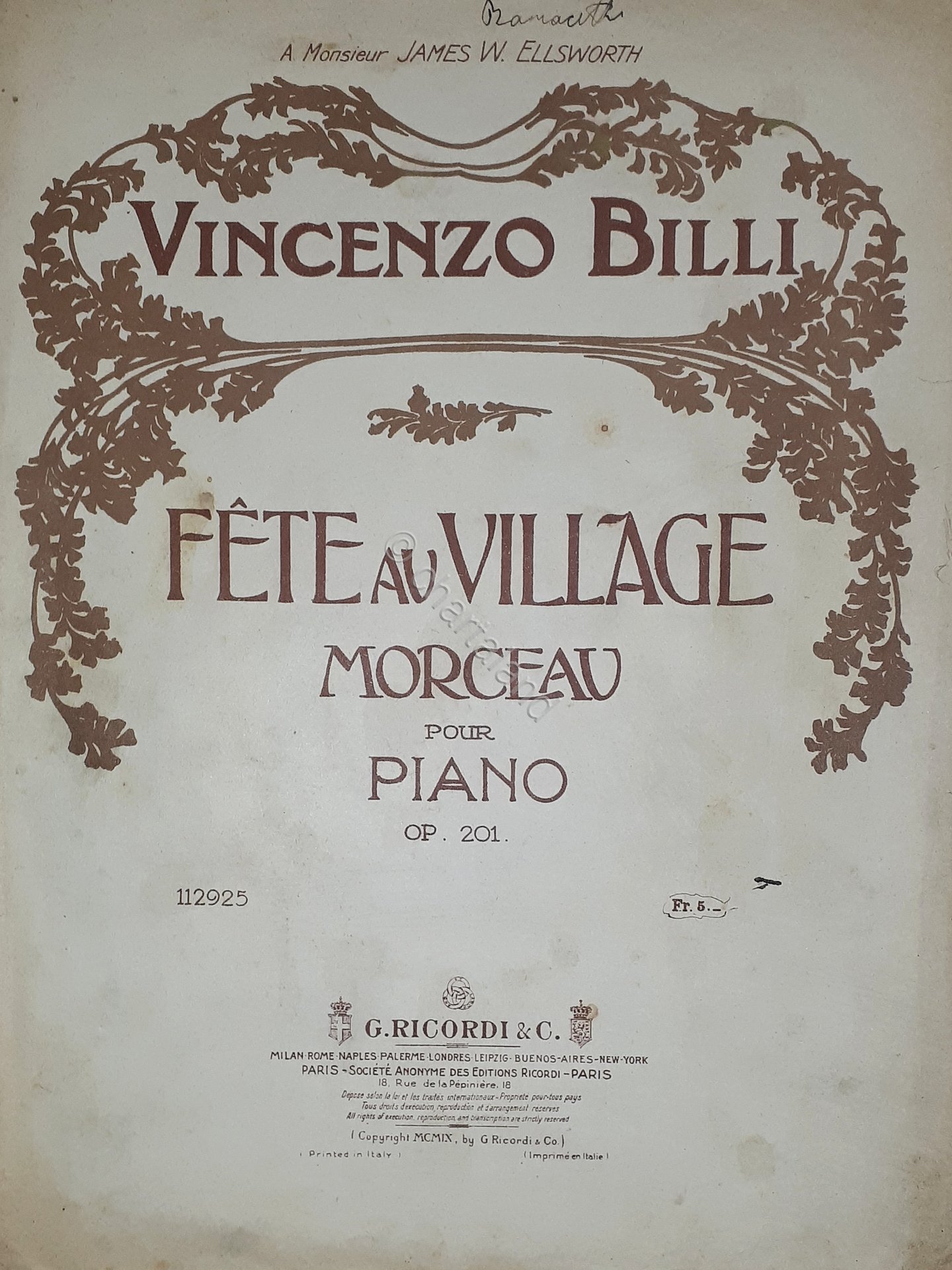 Spartiti - Morceau pour Piano par Vincenzo Billi - Fete au Village Formato Grande, Pagine - 6 Condizioni molto buone come da foto