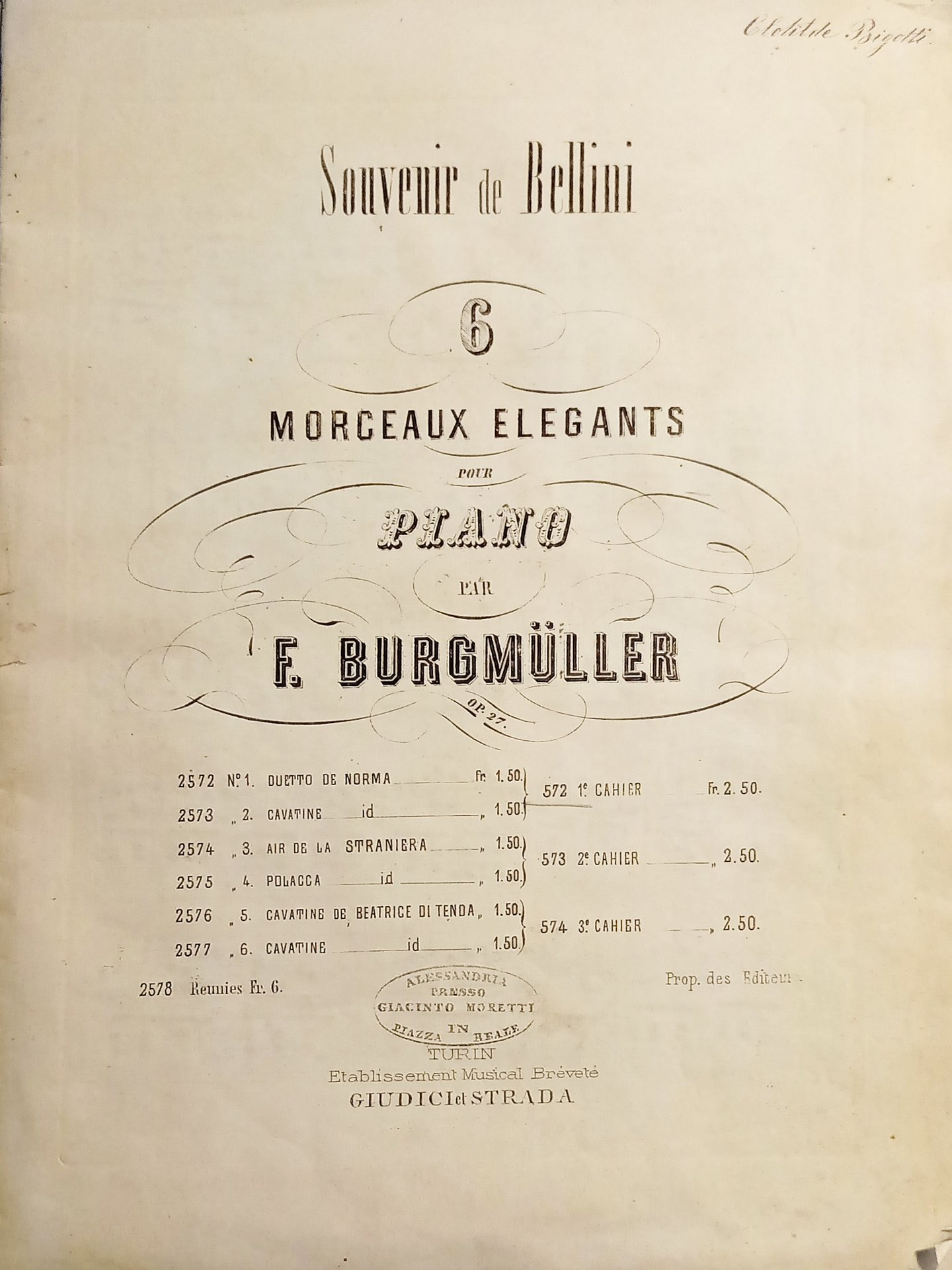 Spartiti - Souvenir de Bellini - Morceaux Elegants pour Piano par F. Burgmüller Formato grane. Pagine 6 Condizioni molto boune.