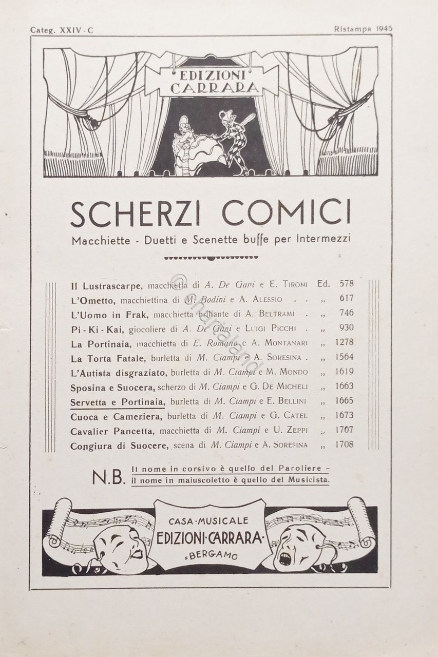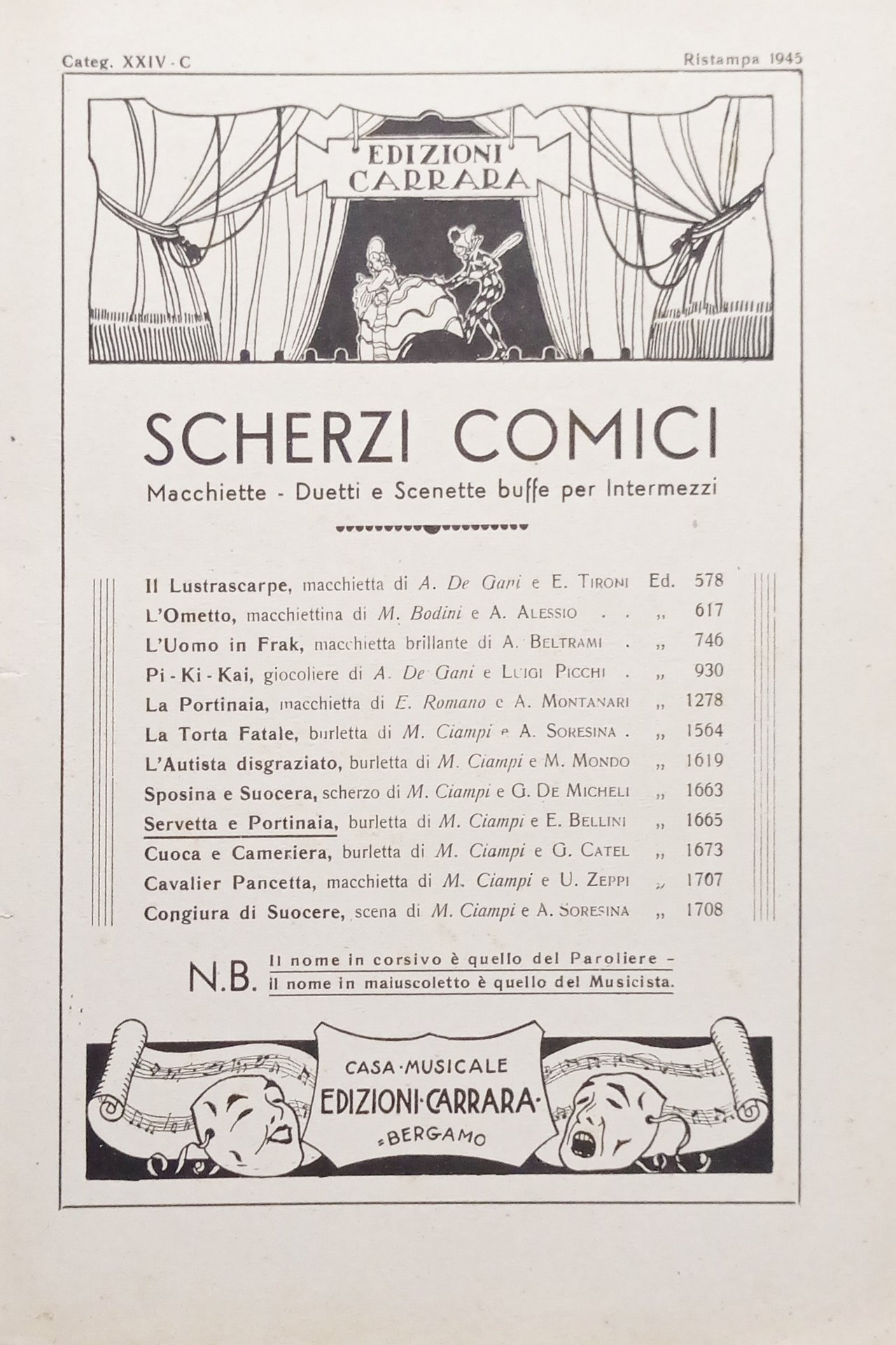 Spartiti - Scherzi Comici - Servetta e Portinaia - Burletta di M. Ciampi e Bellini Formato grande. Pagine 4 Copertina morbida. Condizioni buone con segni del tempo come da foto.