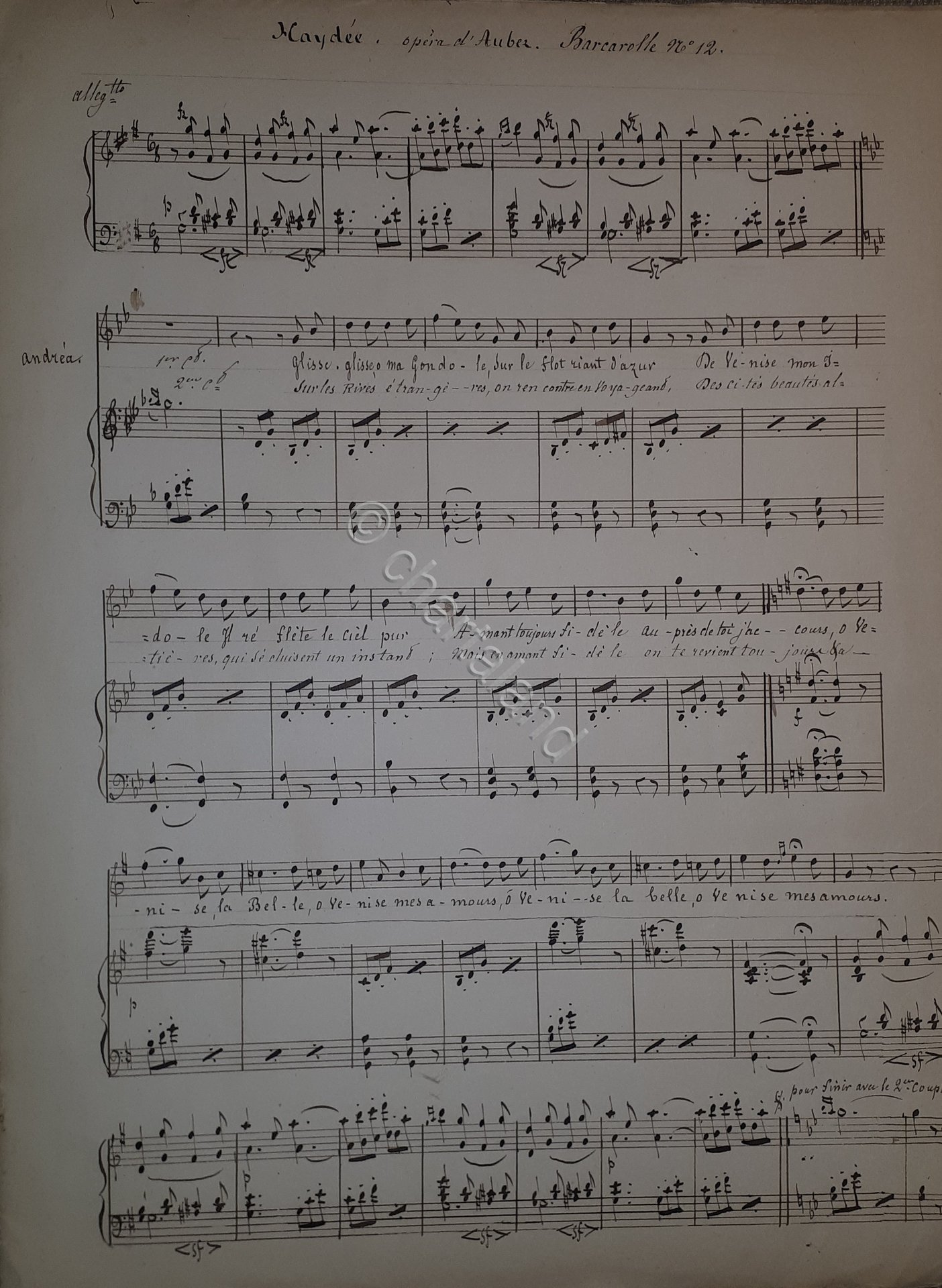 Spartito Manoscritto - Haydee - Opera di Auber - Barcarolle N. 12 - Secolo XIX