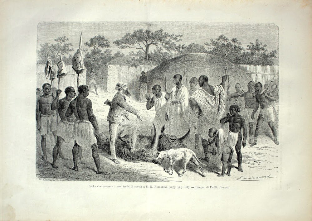Speke che presenta i suoi trofei di caccia a S.M. Rumanika. Stampa 1864 | Libri antichi e moderni | ,
