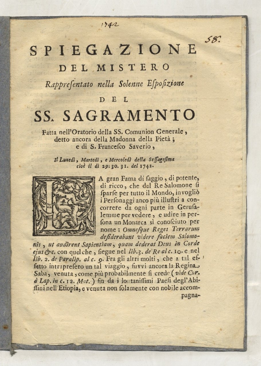 SPIEGAZIONE del mistero rappresentato nella solenne esposizione de SS. Sagramento fatta nell'Oratorio della SS. Comunion Generale detto ancora della Madonna della Pietà, e di S, Francesco Saverio, il lunedì, martedì e mercoledì della sessagesima cioè il dì 29, 30, e 31 del 1742.