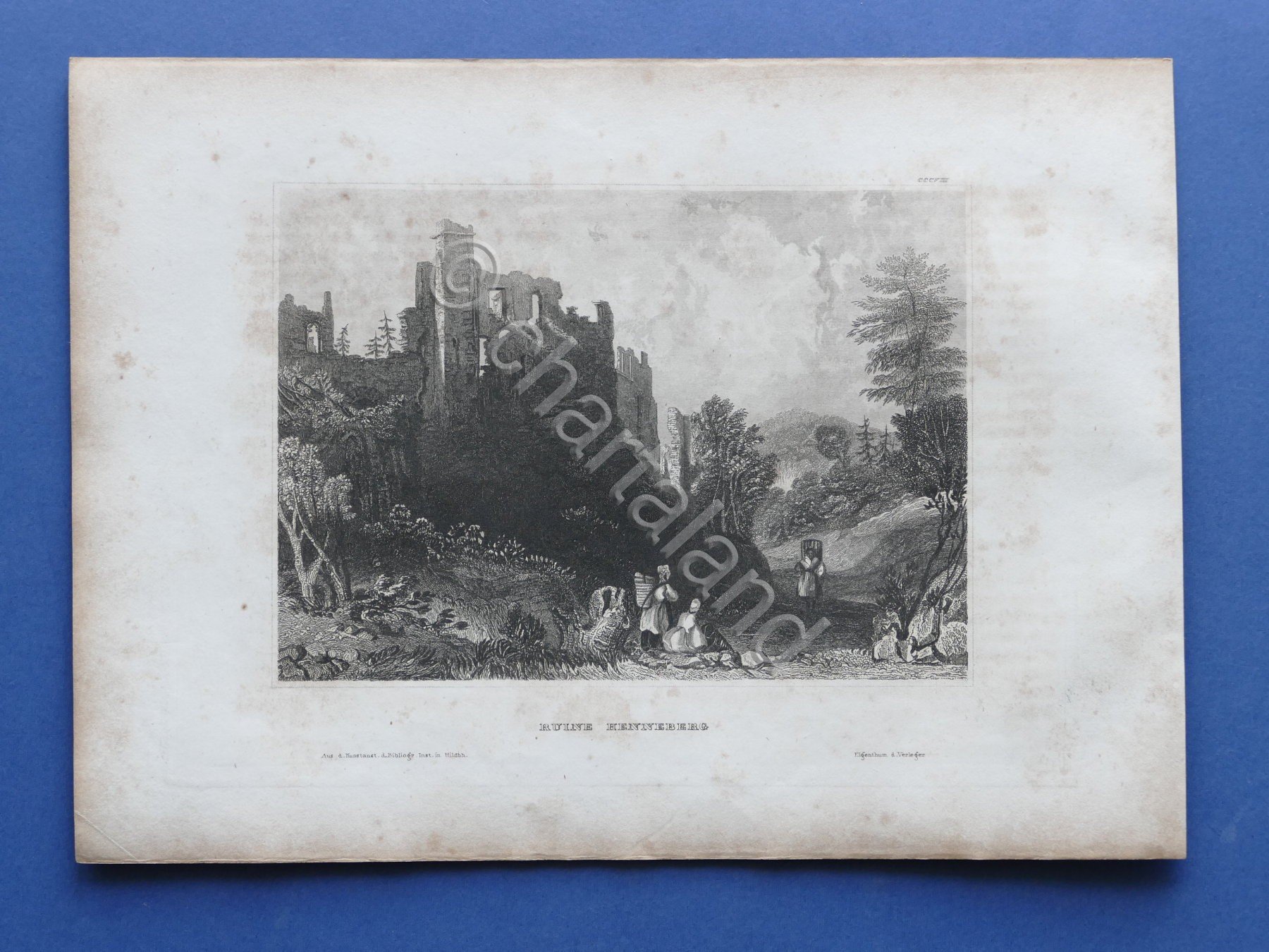 Stampa d'epoca metà '800 Ruine Henneberg - Turingia - Germania Dimensioni foglio: 18 x 25 cm ca. - Dimensioni stampa: 11 x 15 cm ca. Buone condizioni. Tracce di foxing naturale.