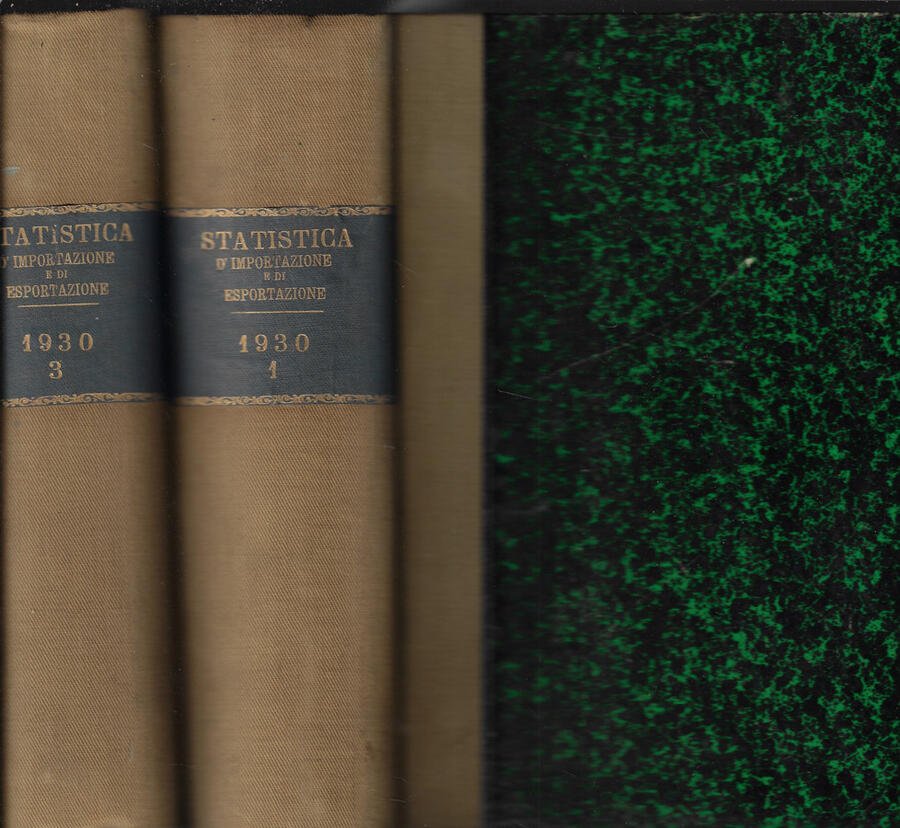 Statistica importazioni ed esportazioni anno 1930 incompleto successivamente rilegato in due volumi rispettivamente dal primo gennaio al 30 aprile e dal 30 settembre al 31 dicembre. Opera a cura del Ministero delle Finanze. Coperte in mezza tela ingiallite dal tempo presentanti segni di usura da scaffale ai margini e da sfregamento ai piatti ove presenti. Pagine fruibili anche se brunite dal tempo in particolare ai tagli e sporadicamente fiorite; bordi a barbe non impedenti la fruibilità. Numerazione delle pagine a più riprese.