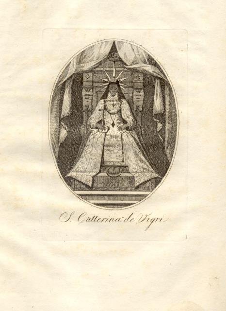 Eretta in onore delle mille Salutazioni Angeliche che detta Santa fu solita recitare nella Notte del Santissimo Natale". "Corretti, e Ristampati l'anno 1726". Seconda edizione. Cm.19,6x14,5. Pg.48. Legatura originale in cartoncino marmorizzato. Una incisione in ovale all'antiporta, raffigurante S.Caterina de Vigri. Il volumetto comprende una Introduzione, lo Statuto del 1726 articolato in dieci Capi, la "Nota de' Confratelli viventi, secondo l'ordine della Fondazione, ed Aggregazione", l'aggiunta del Capitolo undecimo del 1763, del Capitolo dodicesimo del 1769, dei Capitoli 13°-15° del 1786, la "Nota de' Congregati ascritti dopo quelli indicati in questi Statuti sino al 1840" ed infine una "Aggregazione" a stampa con datazione manoscritta 25 Febbraio 1842 e in calce le firme autografe del Priore Antonio Santagata, del Vice Priore Gaetano Zucchini e del Segretario Camillo Ambrogi. Codice libreria 72532.