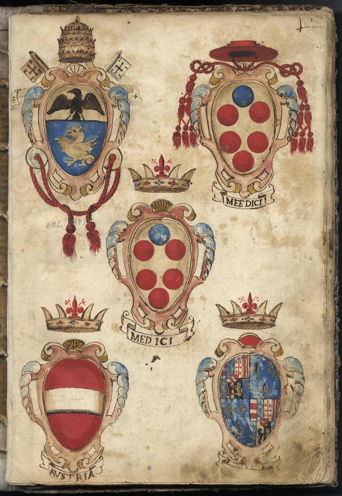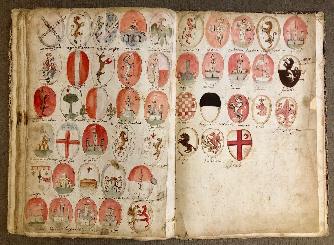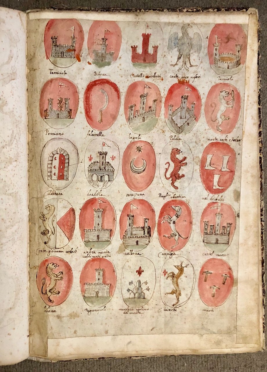 [Toscana], [s.n.], [non prima del 1605 - non dopo il 1621] / [fine del XVI secolo] / [fine dell'800 - primi del ‘900], in-folio, legatura ottocentesca in mezza pergamena (diffuse consunzioni sui piatti), volume miscellaneo manoscritto su carta, così composto: pp. [74] costituenti il grosso del volume, suddivise in: pp. [4] recanti 8 stemmi colorati a mano a tempera inseriti in cornici di tipo manierista-barocco: del Papa (si tratta dello stemma di Paolo V, Camillo Borghese ed è lo stemma che data il primo manoscritto) e di alcune famiglie nobili regnanti in Europa; inoltre 7 stemmi non completati (è disegnata solo la cornice); pp. [70], recanti 807 stemmi di famiglie nobili toscane colorati a mano entro cornici di tipologia manierista-barocca (ma di questi circa 80 non sono finiti e, o recano disegni solo abbozzati nello stemma, o hanno predisposte le sole cornici con l'interno lasciato bianco); seguono pp. [4], databili qualche decennio prima rispetto al nucleo precedente, recanti 73 piccoli stemmi a colori di comuni toscani; concludono il volume pp. [10] stese alla fine del XIX secolo o ai primi del XX recanti un indice di tutte le famiglie toscane presenti nel primo nucleo e che fa riferimento ad una paginazione impressa a timbro all'epoca della stesura dell'indice. E' presente anche una paginazioni più antica - con errori e salti di numerazione - che interessa la prima sezione e l'indice finale (evidentemente steso su carte che facevano parte “ab origine” del primo manoscritto, ma che erano state lasciate bianche). Macchie e aloni sparsi, lievi mancanze marginali; due carte con margine esterno reintegrato. Reintegrato anche il margine delle carte con gli stemmi dei comuni.