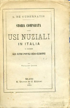 In-8°, pp. 222, legatura moderna m. tela azzurra e angoli. Piatti in carta di Varese, titolo in oro su tassello in pelle al dorso. Brossura originale conservata. Ottimo esemplare in barbe e intonso. Prima edizione di questa bella storia comparata dei riti nuziali presso i vari popoli (nell'àmbito italiano sono presenti svariati riferimenti alle tradizioni matrimoniali del Piemonte: Riva di Chieri, Alba, Bra, Pinerolo, etc.), dai preparativi delle nozze al banchetto e ai cibi nuziali sino alle celebrazioni delle nozze d'argento e delle nozze d'oro. Angelo De Gubernatis (Torino,1840-Roma, 1913), fu professore di sanscrito e glottologia comparata presso l'istituto di studi superiori di Firenze e poi di sanscrito e di letteratura italiana all'Università di Roma. Collaboratore di numerosi periodici italiani e francesi, nel 1887 assunse la direzione del Giornale della società asiatica. Nel 1878 pubblicò il Dizionario biografico degli scrittori contemporanei, molte volte riedito, e fra il 1883 e il 1885 dette alla luce una monumentale Storia Universale della Letteratura in 23 volumi. Traduttore di numerose opere dal sanscrito, effettuò ripetuti viaggi in India dai quali portò in Italia una vasta collezione di reperti poi confluita nel Museo Antropologico di Firenze.