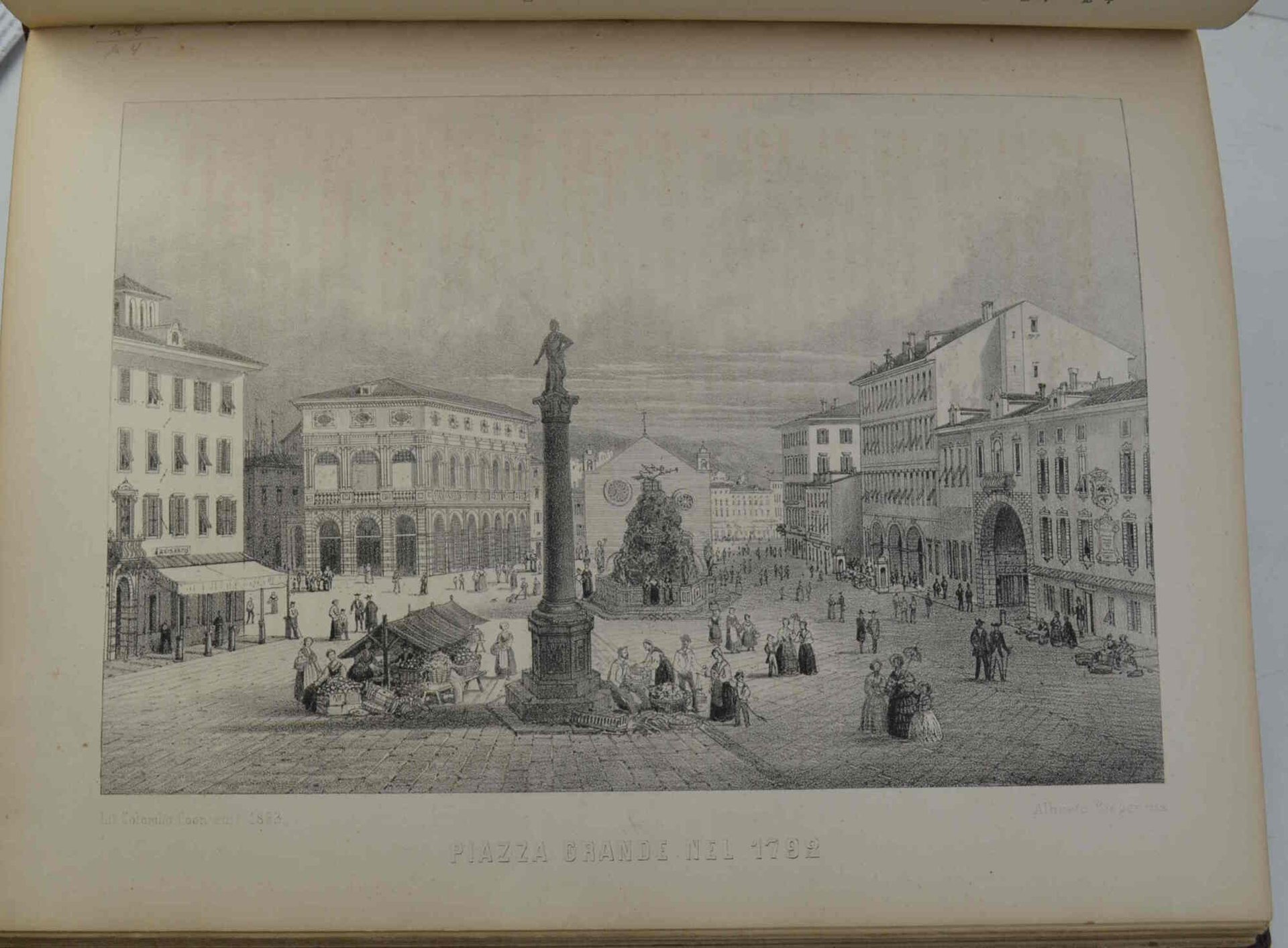 Cm. 33, pp. 279 (1). Con 32 tavole f.t. in litografia. Solida legatura del tempo in mezza percallina con punte, dorso liscio con titoli in oro su tassello. Esemplare genuino, pulito e ben conservato. Edizione originale, interessante e rara di quest'opera munita di un apparato iconografico di grande bellezza. Le tavole raffigurano vedute e scorci della citta, una carta geografica, scene storiche e medaglie.