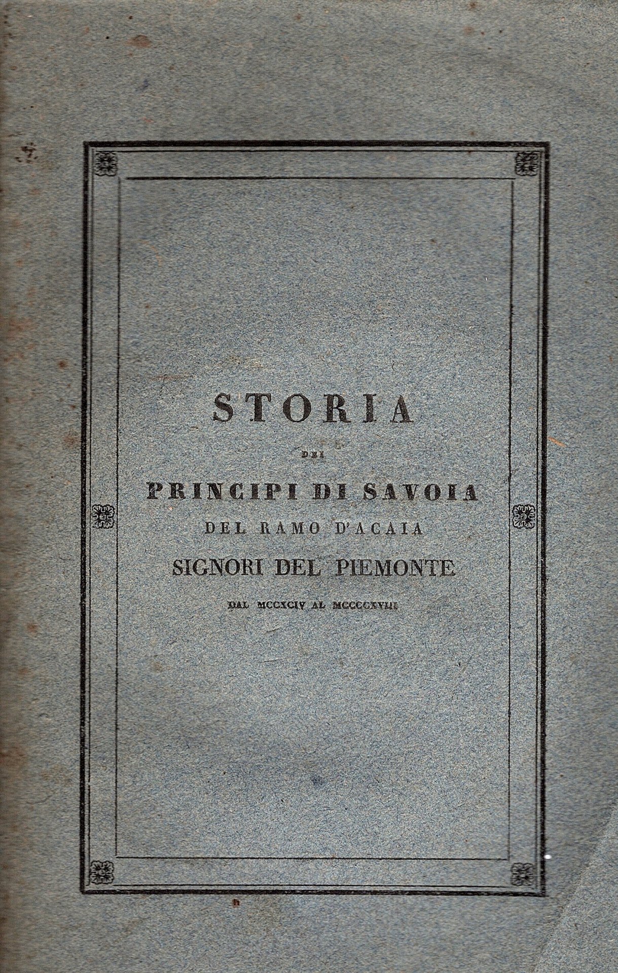 2 volumi in-8° (242x160mm), pp. XV, 366, (2); (6), 302; brossura editoriale azzurra con titoli in nero ai dorsi e ai piatti anteriori entro riquadro. Un albero genealogico nel testo principiante da Tommaso I Conte di Savoia. Ottimo esemplare in barbe. Prima edizione di questa fondamentale opera, basata su ricerche archivistiche di prima mano. Il secondo volume è in gran parte di documenti, quasi tutti editi per la prima volta. 'Il Guichenon, il S. Giorgio, Gioffredo della Chiesa ed il Muletti mi somministrarono notizie su quanto i Principi d'Acaia ebbero a trattare con i Conti Savoia e coi Marchesi di Monferrato e di Saluzzo. Da GuglielmoVentura ricavai i fatti relativi al comune d'Asti, dal Nobile Cibrario quelli del comune di Chieri, le opere di Agostino della Chiesa per le storie particolari di alcuni nostri paesi. Le notizie dei sovraccennati scrittori tutte non bastavano mi venne allora in aiuto la Bontà Sovrana facendomi facoltà di copiare e pubblicare le carte, del regio archivio di corte'. Pietro Luigi Datta, nativo di San Giorgio Canavese (non è certa la sua data di nascita), morto nel 1875 a Padova, fu storico, erudito e paleografo allievo del Vernazza, dal 1822 impiegato nel Regi Archivi. Insieme col Cibrario fu un pioniere nel campo degli studi sul Medioevo in Piemonte. Cfr. Manno, I, 604.