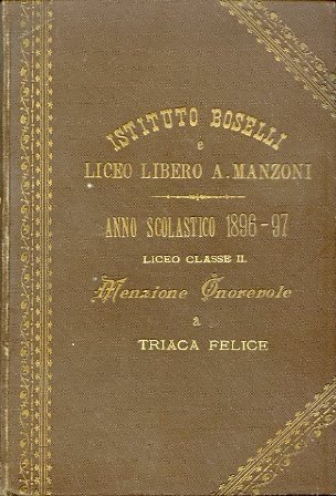 In-16° grande, pp. (4), 367, legatura del tempo t. tela marrone con titolo e fregi ornamentali in oro e super libros in oro al piatto: 'Istituto Boselli e Liceo Libero A. Manzoni. Anno scolastico 1896 - 97 Liceo classe II menzione onorevole a Triaca Felice'. Sguardie a decori vegetali. Bell'esemplare. Prima edizione del maggiore volume ottocentesco sulla critica pariniana; da pp. 337 a 364 'Saggio di bibliografia pariniana in servizio alla storia del Giorno'. Il volume, fra i capolavori del Carducci critico, contiene una magistrale analisi della poesia pariniana che lo pone fra gli incunaboli della moderna critica stilistica. Parenti, Rarità, V, 313. Parenti, Prime edizioni, p. 130.