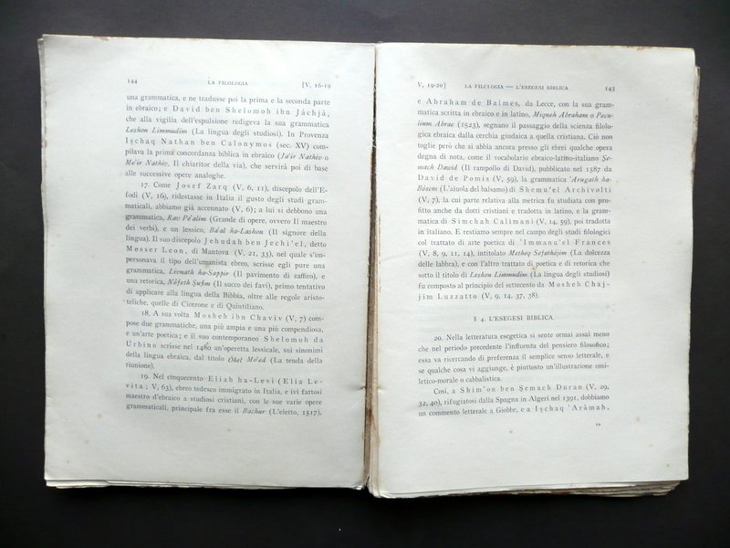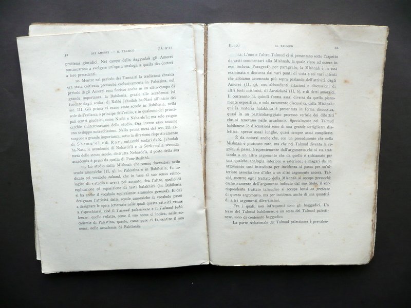 Umberto Cassuto, Storia della Letteratura Ebraica Postbiblica Casa Editrice Israel", Firenze 1938, cm 22,5x16,5, pp. XVI-216; brossura ed. Condizioni di conservazione Esemplare in condizioni pi√π che discrete con alcuni piccoli leggeri aloni alle brossure; angoli della brossura ant. e della prima bianca entrambi con una traccia di piega (vedi foto); parte inf. del dorso con una lieve ombra di gora che non interessa le pagine. Interni buoni con alcune piccole lievi bruniture, ancora intonsi (esemplare mai letto); cerniera interna post. e margini interni di alcune pagine fessurati, con conseguente allentamento delle cuciture (vedi foto). Interni ancora intonsi (esemplare mai letto). SETT124.L12039 N "